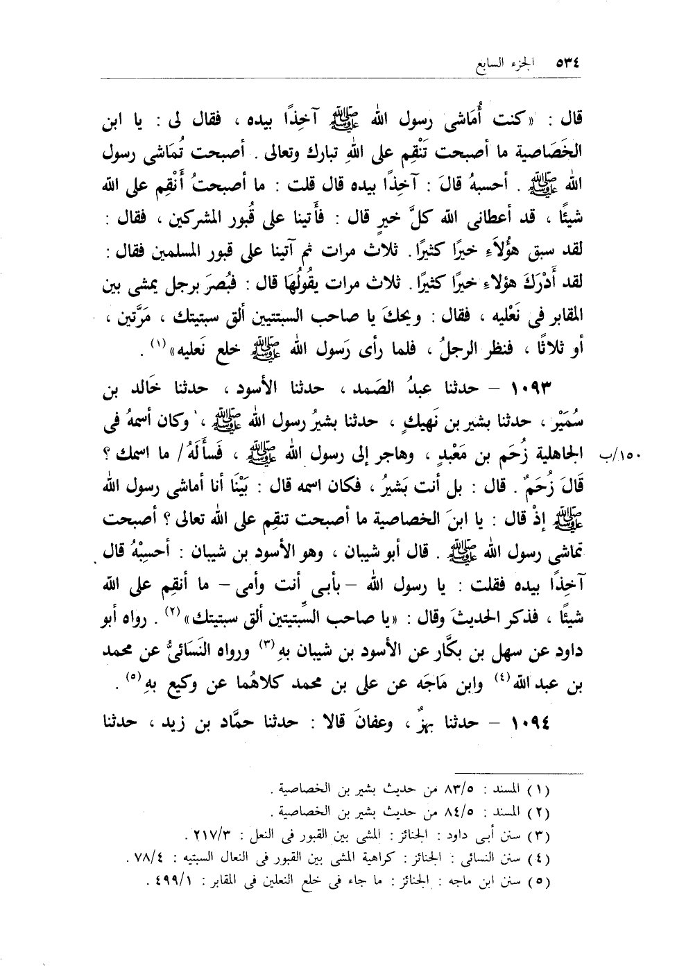 1093 - حدثنا عبدُ الصمد، حدثنا الأسود، حدثنا خالد بن سُمَيْر، حدثنا بشير بن نَهيكٍ، حدثنا بشيرُ رسول الله - صلى الله عليه وسلم -، وكان اسمهُ في الجاهلية زُحَم بن معبدٍ، وهاجر إلى رسول الله - صلى الله عليه وسلم -، فسألهُ/ ما اسمك؟ قال زُحَمٌ. قال: بل أنت بَشيرُ، فكان اسمه قال: بينا أنا أماشي رسول الله - صلى الله عليه وسلم - إذ قال: يا ابن الخصاصية ما أصبحت تنقِم على الله تعالى؟ أصبحت تماشي رسول الله - صلى الله عليه وسلم -. قال أبو شيبان، وهو الأسود ابن شيبان: أحسبِهُ قال آخذاً بيده فقلت: يارسول الله - بأبي أنت وأمي - ما أنقِم على الله شيئاً، فذكر الحديث وقال: (ياصاحب السبتيتين ألق سبتيتك) (¬1) . رواه أبو داود عن سهل بن بكار عن الأسود بن شيبان به (¬2) ورواه النسائي عن محمد بن عبد الله (¬3) وابن ماجه عن علي بن محمد كلاهما عن وكيع بهِ (¬4) .