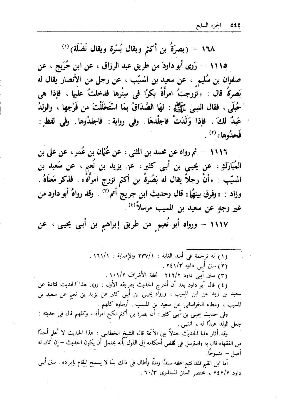 1115 - روى أبو داود من طريق عبد الرزاق، عن ابن جُريج، عن صفوان بن سُليمٍ، عن سعيد بن المسيب، عن رجل من الأنصار يقال له بَصَرةُ قال: (تزوجتُ امرأةً بكراً في سِتْرها فدخلتُ عليها، فإذا هي حُبلَى، فقال النبي - صلى الله عليه وسلم -: لها الصداقُ بما استحللتَ من فرجها، والولدُ عبدٌ لكَ، فإذا ولدتْ فاجلْدهَا. وفي رواية: فاجلدُوها. وفي لفظٍ: فحدُوها) (¬2) .