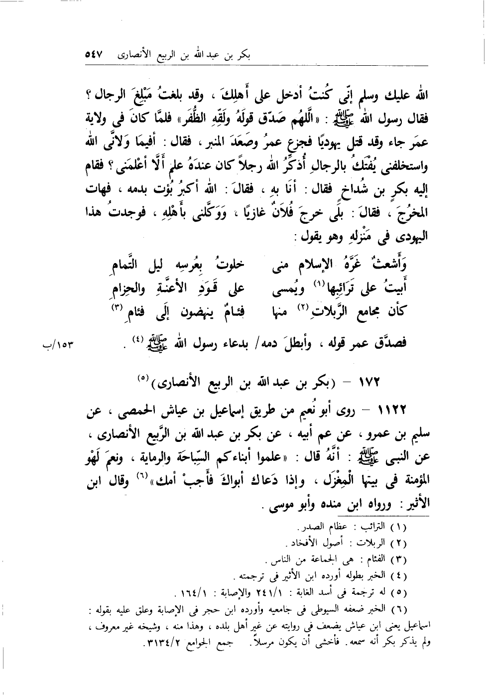 (¬2) الخبر ضعفة السيوطي في جامعيه وأورده ابن حجر في الإصابة وعلق عليه بقوله: إسماعيل يعني ابن عياش يضعف في روايته عن غير أهل بلده، وهذا منه، وشيخه غير معروف، ولم يذكر بكر أنه سمعه. فأخشى أن يكون مرسلاً. جمع الجوامع 2/3134.