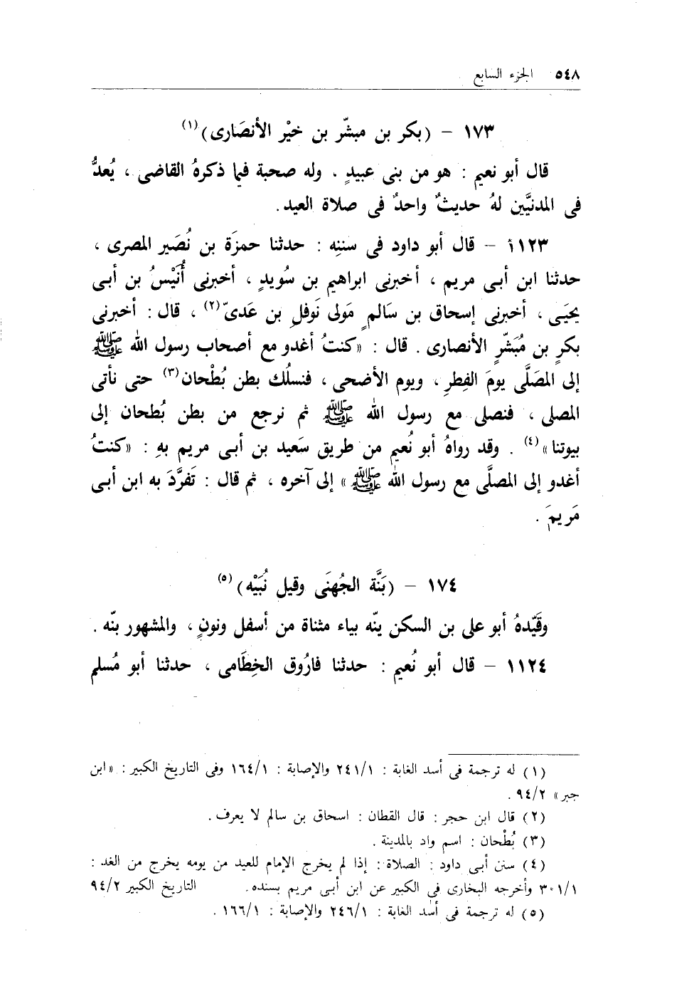 1123 - قال أبو داود في سننه: حدثنا حمزة بن نُصير المصري، حدثنا ابن أبي مريم، أخبرني إبراهيم بن سُويدٍ، أخبرني أُنَيْسُ بن أبي يحيى، أخبرني إسحاق بن سالمٍ مولى نوفلِ بن عَدي (¬2) ، قال: أخبرني بكرٍ بن مُبَشّرٍ الأنصاري. قال: (كنت أغدو مع أصحاب رسول الله - صلى الله عليه وسلم - إلى المصلى يوم الفِطر، ويوم الأضحى، فنسلُك بطن بُطحان (¬3) حتى نأتي المصلى، فنصلي مع رسول الله - صلى الله عليه وسلم - ثم نرجع من بطن بُطحان إلى بيوتنا) (¬4) . وقد رواهُ أبو نُعيم من طريق سعيد بن أبي مريم بهِ: (كنتُ أغدو إلى المصلَّى مع رسول الله - صلى الله عليه وسلم - (إلى آخره، ثم قال: تفرَّد به ابن أبي مريم.