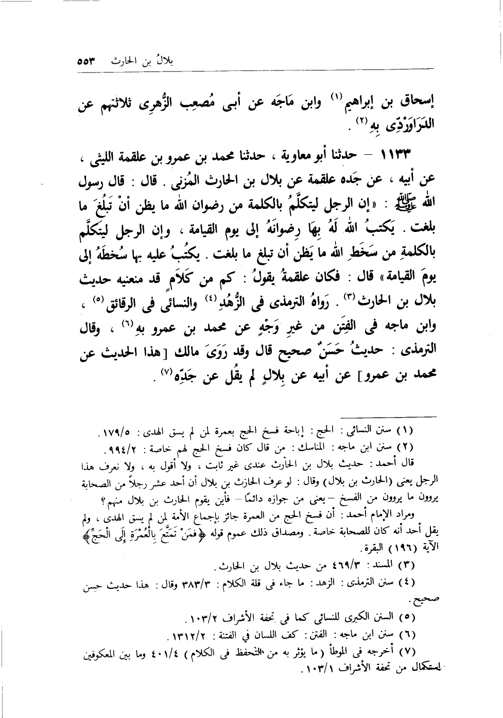 1133 - حدثنا أبو معاوية، حدثنا محمد بن عمرو بن علقمة الليثي، عن أبيه، عن جده علقمة عن بلال بن الحارث المُزني. قال: قال رسول الله - صلى الله عليه وسلم -: (إن الرجل ليتكلم بالكلمة من رضوان الله ما يظن أن تبلُغَ ما بلغت. يكتبُ الله لهُ بها رضوانهُ إلى يوم القيامة، وإن الرجل ليتكلم بالكلمةِ من سخط الله ما يظن أن تبلغ ما بلغت. يكتُبُ عليه سُخطهُ إلى يوم القيامة) قال: فكان علقمةُ يقولُ: كم من كلامٍ قد منعنيه حديث بلال بن الحارث (¬1) . رواهُ الترمذي في الزُّهُدِ (¬2) والنسائي في الرقائق (¬3) ، وابن ماجه في الفِتَن من غير وجهٍ عن محمد بن عمرو به (¬4) ، وقال الترمذي: حديثُ حسنٌ صحيح قال وقد روى مالك [هذا الحديث عن محمد بن عمرو] عن أبيه عن بلالٍ لم يقُل عن جده (¬5) .