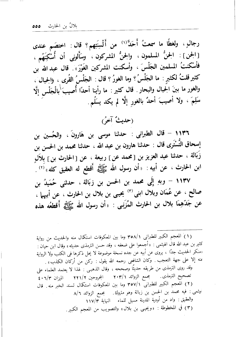 1136 - قال الطبراني: حدثنا موسى بن هَارونَ، والحُسين بن إسحاق التُستري قال: حدثنا هارون بن عبد الله، حدثنا محمد بن الحسن بن زَبَالة، حدثنا عبد العزيز بن [محمد عن] ربيعة، عن [الحارث بن] بلالٍ ابن الحارث، عن أبيه: (أن رسول الله - صلى الله عليه وسلم - أَقطع له العقيق كله) (¬1) .