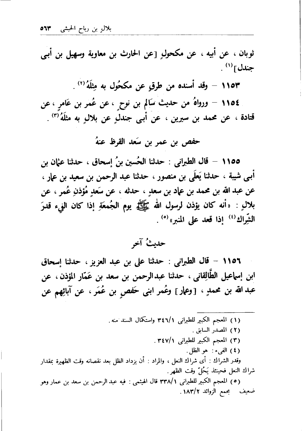 1155 - قال الطبراني: حدثنا الحُسين بن إسحاق، حدثنا عثمان بن أبي شيبة، حدثنا يعلى بن منصور، حدثنا عبد الرحمن بن سعيد بن عامر، عن عبد الله ابن محمد بن عماد بن سعدٍ، حدثه، عن سعدٍ مُؤذنِ عُمر، عن بلالٍ: (أنه كان يؤذن