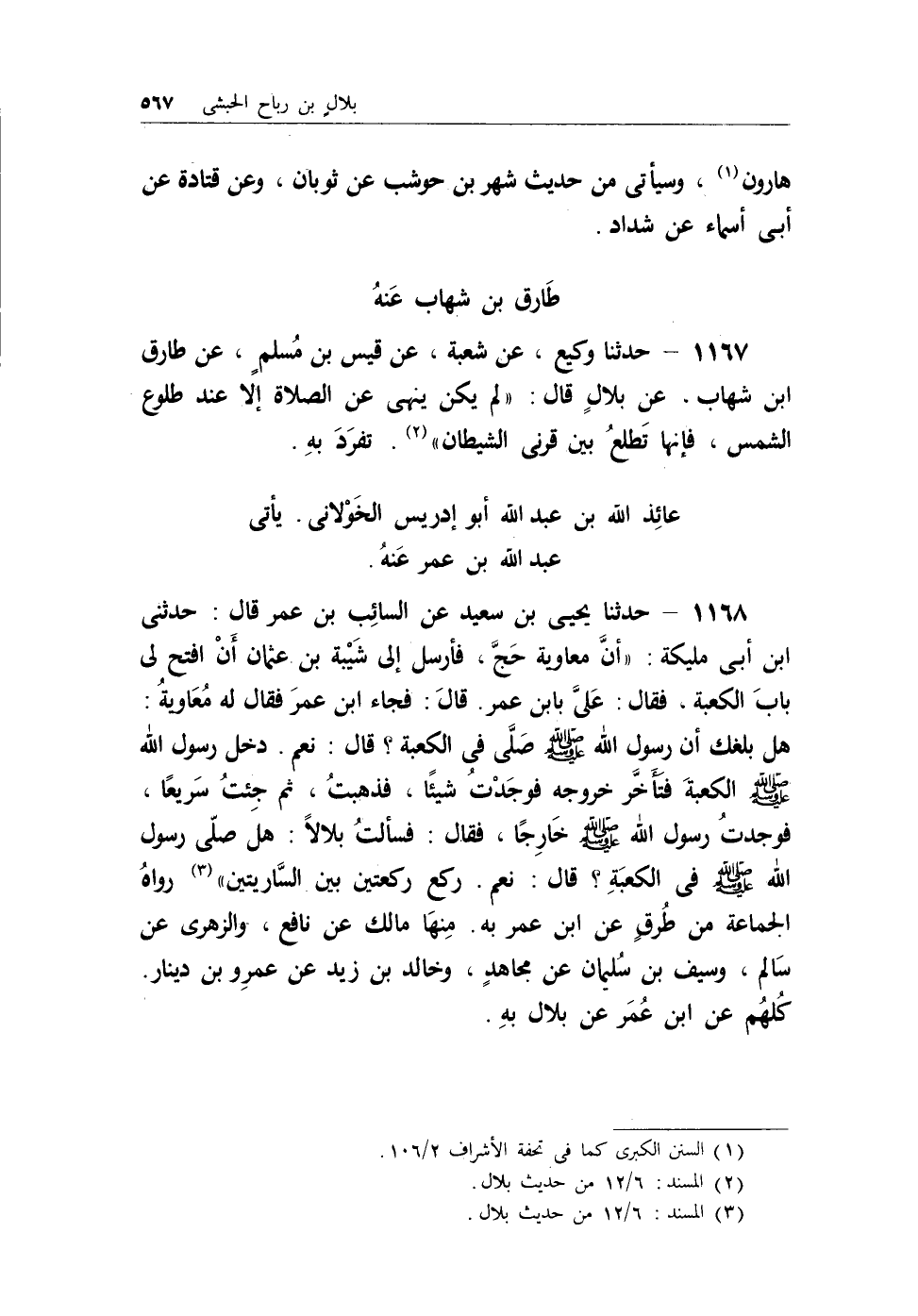 1167 - حدثنا وكيع، عن شعبة، عن قيس بن مُسلمٍ، عن طارق بن شهاب، عن بلالٍ قال: (لم يكن ينهى عن الصلاة إلا عند طلوع الشمس، فإنها تطلعُ بين قرني الشيطان) (¬1) . تفرد به.