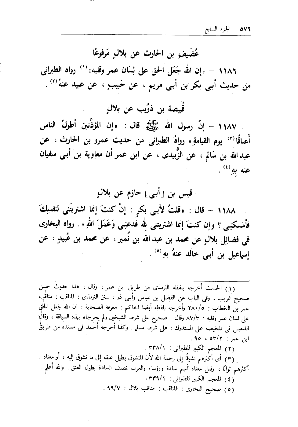 1188 - قال: (قلتُ لأبي بكرٍ: إنْ كنتَ إنما اشتريتني لنفسِكَ فأمسكني؟ وإن كنت إنما اشتريتني لله فدعني وعمل الله) . رواه البخاري في فضائل بلالٍ عن محمد بن عبد الله بن نُمير، عن محمد بن عُبيدٍ، عن إسماعيل بن أبي خالد عنهُ بهِ (¬5) .