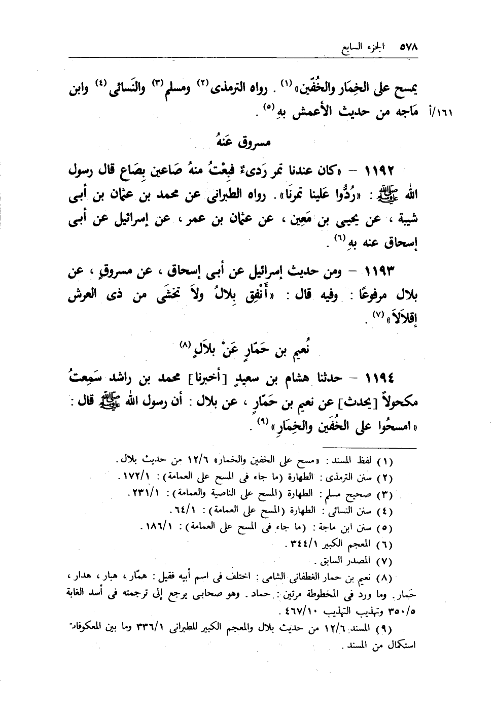 1194 - حدثنا هشام بن سعيدٍ [أخبرنا] محمد بن راشد سمعتُ مكحولاً [يحدث] عن نعيم بن حمارٍ، عن بلال: أن رسول الله - صلى الله عليه وسلم - قال: (امسحوا على الخُفين والخِمار) (¬4) .