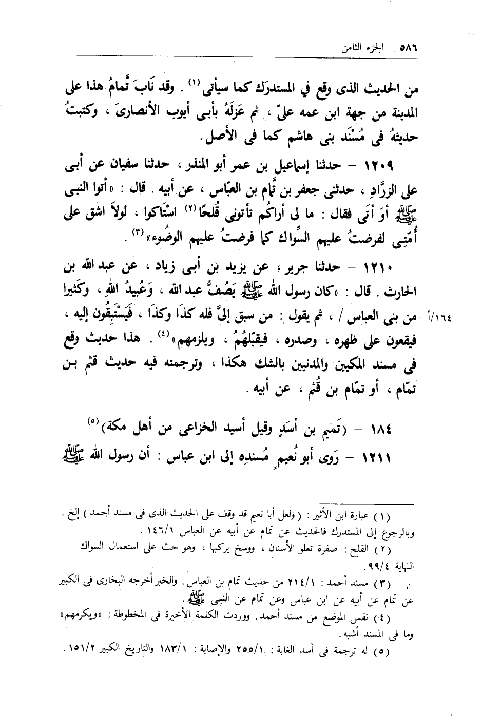 (¬1) عبارة ابن الأثير: (ولعل أبا نعيم قد وقف على الحديث الذي في مسند أحمد) إلخ. وبالرجوع إلى المستدرك فالحديث عن تمام عن أبيه عن العباس 1/146.