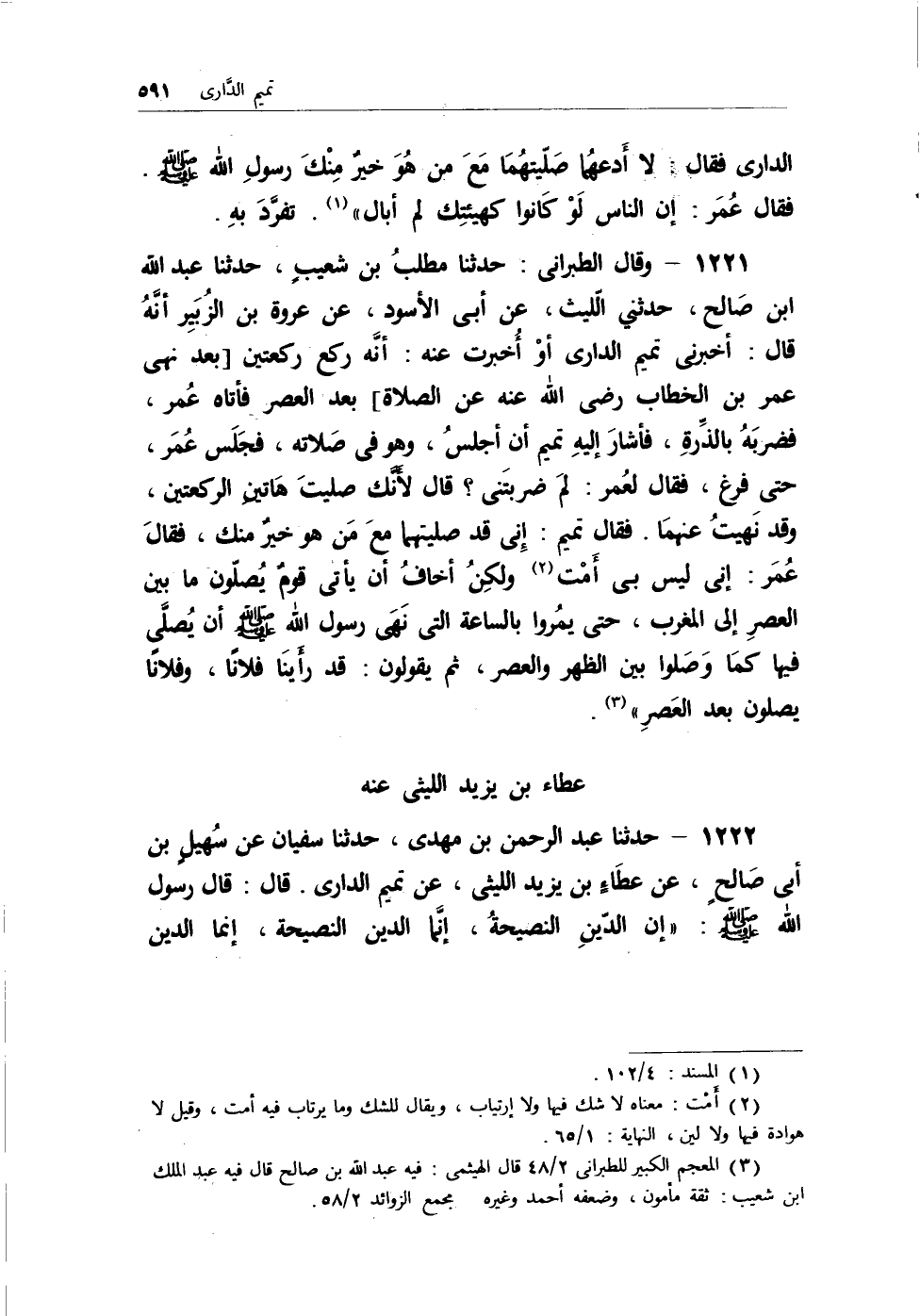 1222 - حدثنا عبد الرحمن بن مهدي، حدثنا سفيان عن سُهيلٍ بن أبي صالحٍ، عن عطاءٍ بن يزيد الليثي، عن تميم الداري. قال: قال رسول الله - صلى الله عليه وسلم -: (إن الدين النصيحةُ، إنما الدين النصيحة، إنما الدين