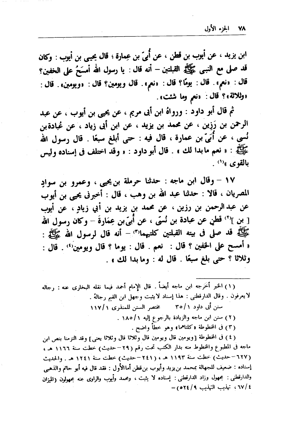 (¬3) في المخطوطة [ويومين قال ويومين قال وثلاثا قال وثلاثا يعني] وقد التزمنا بنص ابن ماجه في المطبوع والمخطوط منه بدار الكتب تحت رقم (29 - حديث) خطت سنة 1166هـ، (627 - حديث) خطت سنة 1193هـ، (241 - حديث) خطت سنة 1241هـ. والحديث إسناده: ضعيف للجهالة بمحمد بن بزيد وأيوب بن قطن أَمَّا الأول: فقد قال فيه أبو حاتم والذهبي والدارقطني: مجهول وزاد الدارقطني: إسناده لا يثبت، ومحمج وأيوب والراوي عنه مجهولون (الميزان 4/67، تهذيب التهذيب 9/524) .