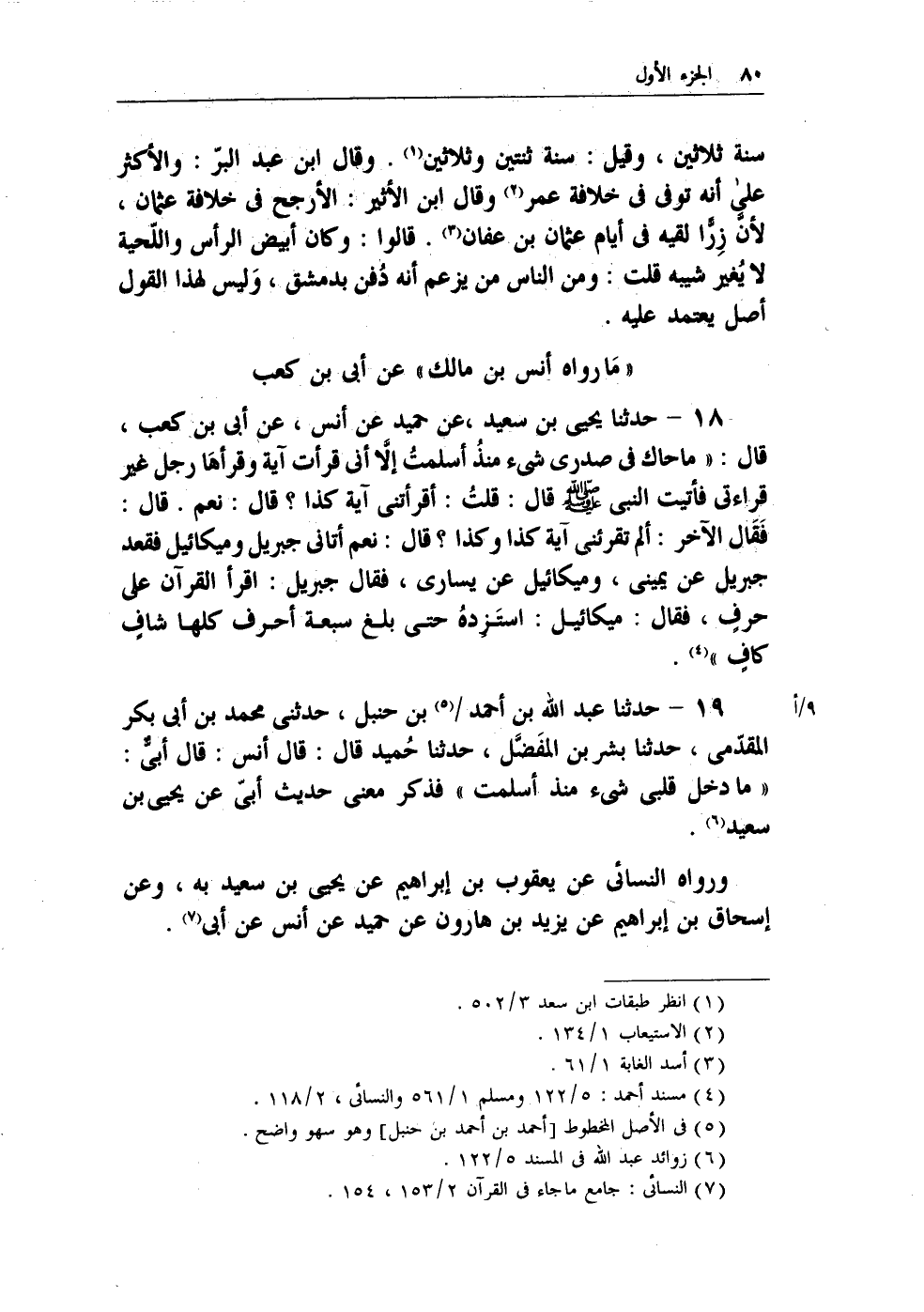 18 - حدثنا يحيى بن سعيد، عن حميد عن أنس، عن أبي بن كعب، قال: (ماحاك في صدري شئ منذُ أسلمتُ إلاَّ أني قرأت آية وقرأهَا رجل غير قراءتي فأتيت النبي - صلى الله عليه وسلم - قال: قلتُ: أقرأتني آية كذا؟ قال: نعم. قال: فَقَال الآخر: ألم تقرئني آية كذا وكذا؟ قال: نعم أتاني جبريل وميكائيل فقعد جبريل عن يميني، وميكائيل عن يساري، فقال جبريل: اقرأ القرآن على حرفٍ، فقال: ميكائيل: استزِدهُ حتى بلغ سبعة أحرف كلها شافٍ كافٍ) (¬1) .