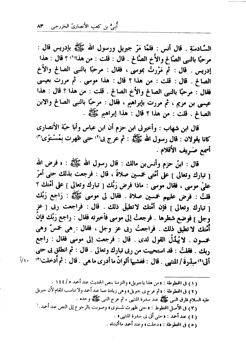 (¬2) () ... في المخطوطة: (ثم عرج بي جبريل) وهي زيادة عما عند أحمد ولا تناسب المقام لأن جبريل عليه السلام فارق النبي - صلى الله عليه وسلم - عند سدرة المنتهى، ثم عرج النبي - صلى الله عليه وسلم - وحده.