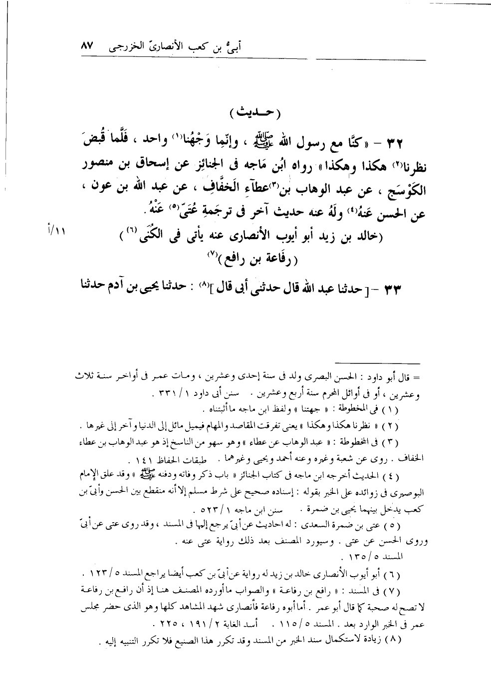 32 - (كنا مع رسول الله - صلى الله عليه وسلم -، وإنما وجهنا (¬1) واحد، فلما قُبض نظرنا (¬2) هكذا وهكذا) رواه ابن ماجه في الجنائز عن إسحاق بن منصور الكوسج، عن عبد الوهاب بن (¬3) عطآء الخفاف، عن عبد الله بن عون، عن الحسن عنهُ (¬4) وله عنه حديث آخر في ترجمة عُتيّ (¬5) عنه.