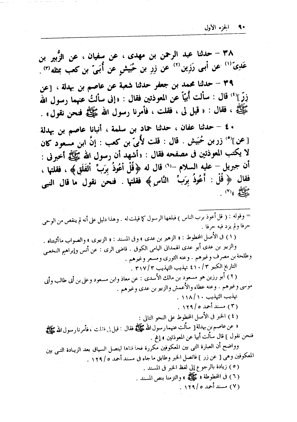 40 - حدثنا عفان، حدثنا حماد بن سلمة، أنبأنا عاصم بن بهدلة [عن] (¬5) زر بن حُبيش. قال: قلت لأُبي بن كعب: إن ابن مسعود كان لا يكتب المعوذتين في مصفحه فقال: (أشهد أن رسول الله - صلى الله عليه وسلم - أخبرني: أن جبريل - عليه السلام - (¬6) قال له {قُل أعوذُ برب الفلق} ، فقلتها، فقال {قل: أعوذ برب الناس} فقلتها. فنحن نقول ما قال النبي - صلى الله عليه وسلم -) (¬7) .