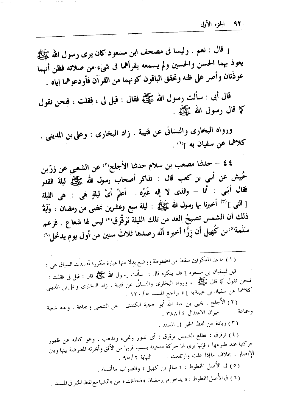 44 - حدثنا مصعب بن سلام حدثنا الأجلح (¬1) عن الشعبي عن زرّ بن حُبيش عن أبي بن كعب قال: تذاكر أصحاب رسول الله - صلى الله عليه وسلم - ليلة القدر فقال أبي: أنا - والذي لا إله غيره - أعلم أي ليلةٍ هي: هي الليلة [التي] (¬2) أخبرنا بها رسول الله - صلى الله عليه وسلم -: ليلة سبع وعشرين تمضي من رمضان، وآيةُ ذلك أن الشمس تصبحُ الغد من تلك الليلة ترقرق (¬3) ليس لها شعاع. فزعم سلمة (¬4) بن كُهيل أن زرًّا أخبره أنه رصدها ثلاث سنين من أول يوم يدخُل (¬5)