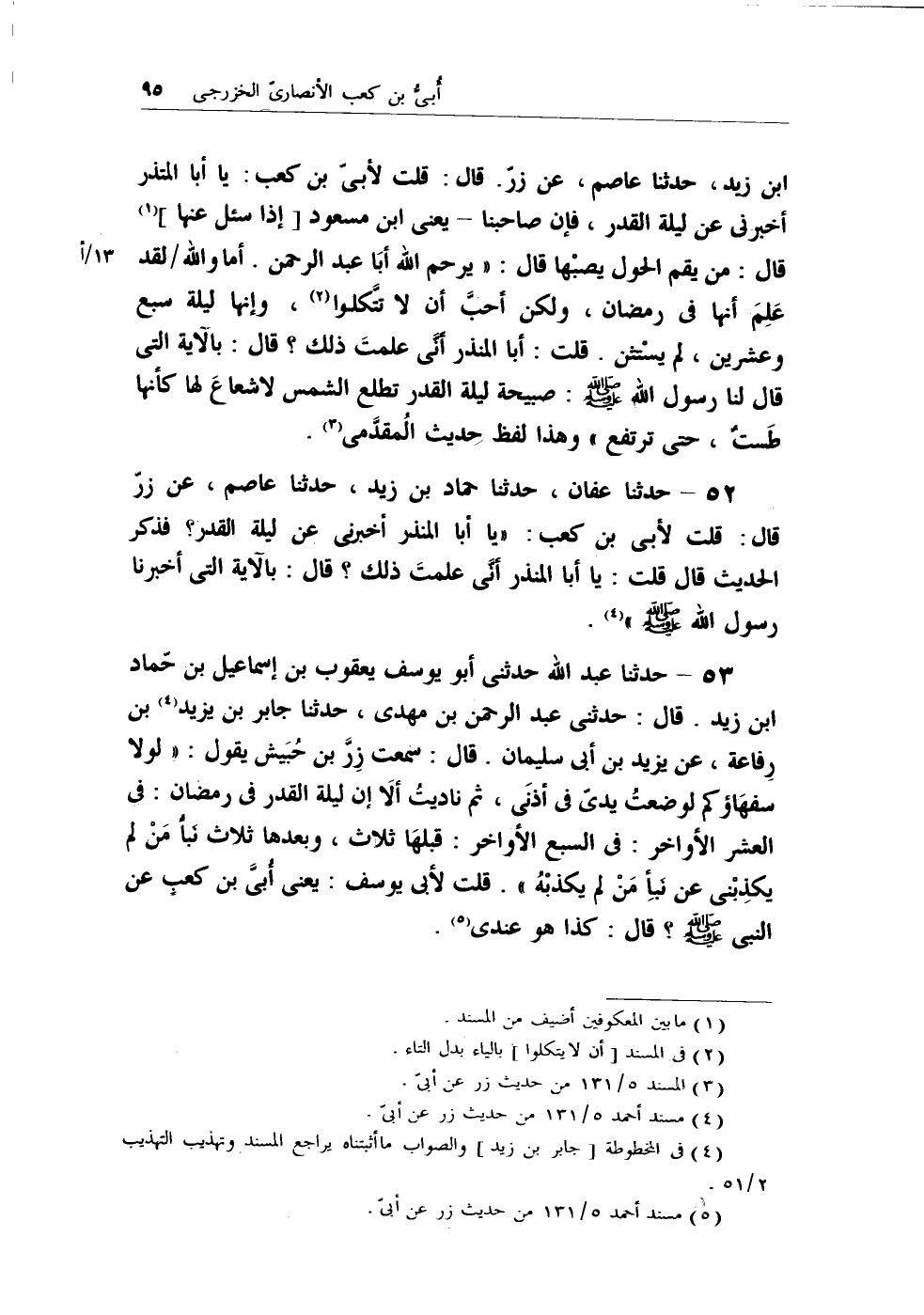 52 - حدثنا عفان، حدثنا حماد بن زيد، حدثنا عاصم، عن زر قال: قلت لأبي بن كعب: (يا أبا المنذر أخبرني عن ليلة القدر؟ فذكر الحديث قال قلت: يا أبا المنذر أني علمت ذلك؟ قال: بالآية التي أخبرنا رسول الله - صلى الله عليه وسلم -) (¬1) .