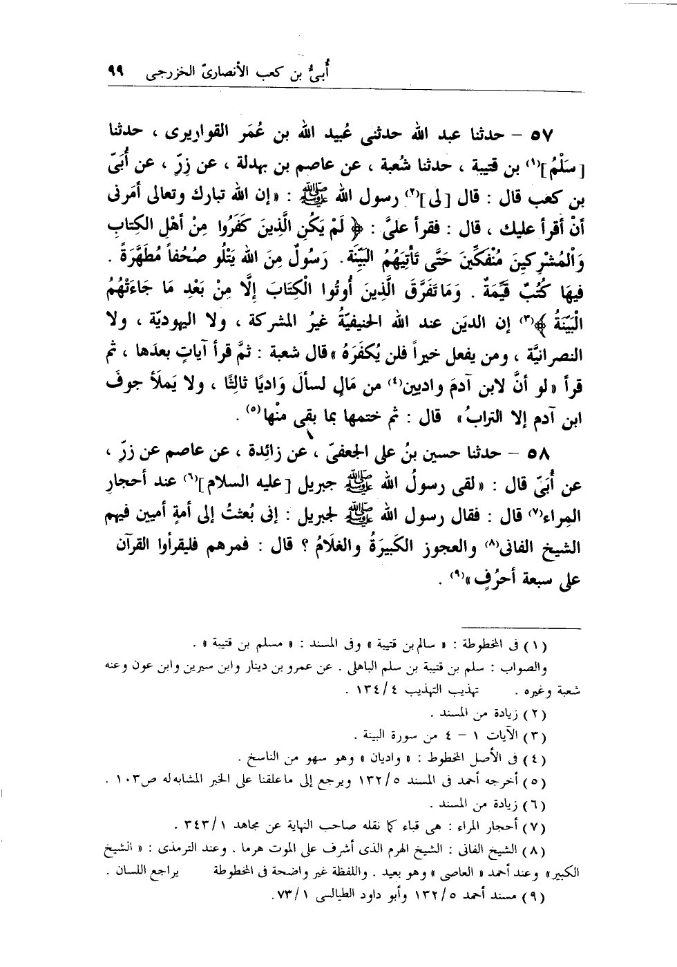 بن قتيبة، حدثنا شُعبة، عن عاصم بن بهدلة، عن زرٍّ، عن أُبَي بن كعب قال: قال [لي] (¬2) رسول الله - صلى الله عليه وسلم -: (إن الله تبارك وتعالى أمرني أن أقرأ عليك، قال: فقرأ عليَّ: {لَمْ يَكُنْ الَّذِينَ كَفَرُوا مِنْ أَهْلِ الْكِتَابِ وَالْمُشْرِكِينَ مُنفَكِّينَ حَتَّى تَأْتِيَهُمْ الْبَيِّنَةُ رَسُولٌ مِنْ اللَّهِ يَتْلُوا صُحُفًا مُطَهَّرَةً فِيهَا كُتُبٌ قَيِّمَةٌ وَمَا تَفَرَّقَ الَّذِينَ أُوتُوا الْكِتَابَ إِلاَّ مِنْ بَعْدِ مَا جَاءَتْهُمْ الْبَيِّنَةُ} (¬3) إن الدين عند الله الحنيفيةُ غيرُ المشركة، ولا اليهودية، ولا النصرانية، ومن يفعل خيراً فلن يُكفرهُ) قال شعبة: ثمَّ قرأ آياتٍ بعدها، ثم قرأ (لو أنَّ لابن آدم واديين (¬4) من مالٍ لسأل وادياً ثالثاً، ولا يملأ جوف ابن آدم إلا الترابُ) قال: ثم ختمها بما بقي منْها (¬5) .