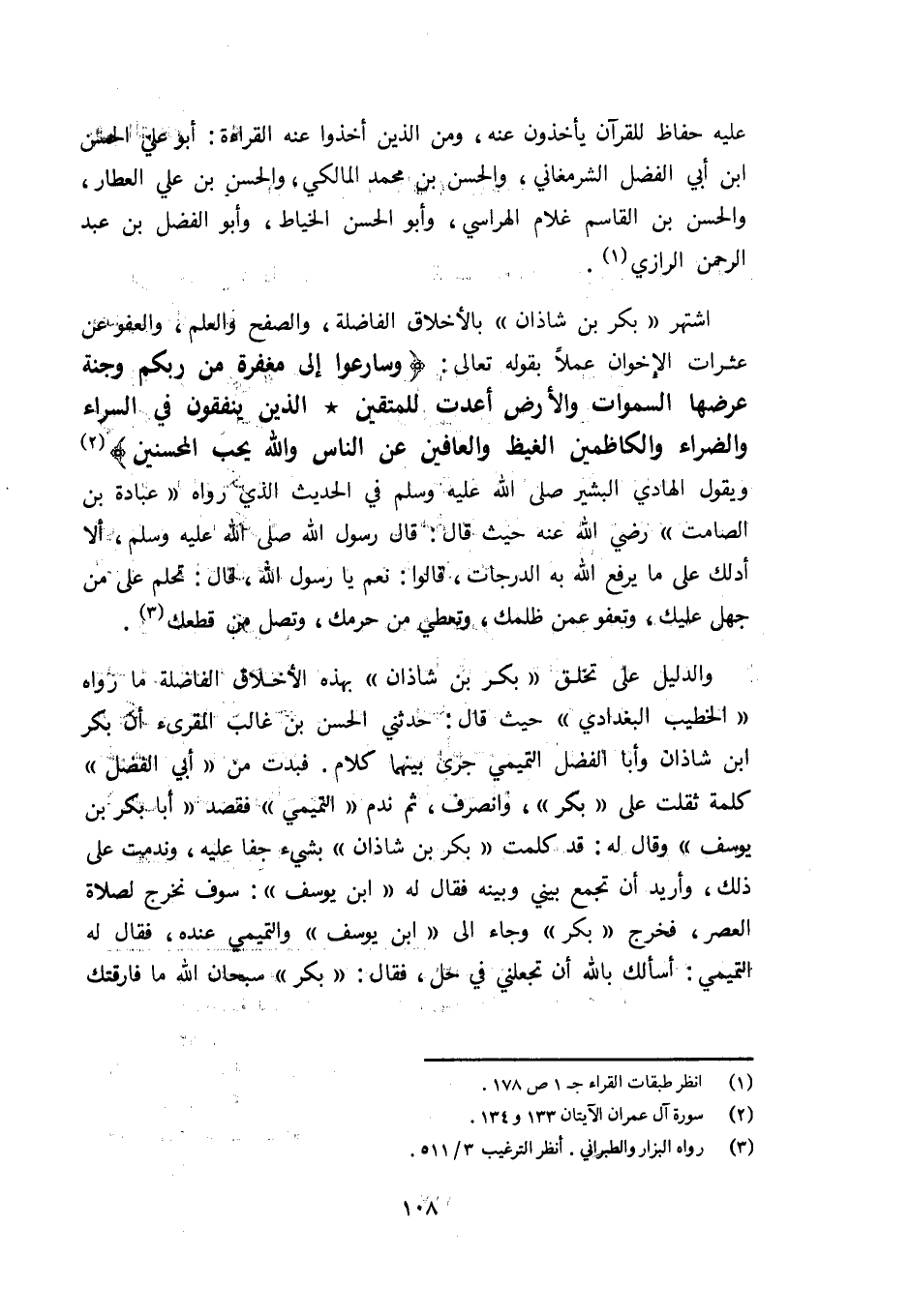 اشتهر «بكر بن شاذان» بالأخلاق الفاضلة، والصفح والعلم، والعفو عن عثرات الإخوان عملا بقوله تعالى: وَسارِعُوا إِلى مَغْفِرَةٍ مِنْ رَبِّكُمْ وَجَنَّةٍ عَرْضُهَا السَّماواتُ وَالْأَرْضُ أُعِدَّتْ لِلْمُتَّقِينَ* الَّذِينَ يُنْفِقُونَ فِي السَّرَّاءِ وَالضَّرَّاءِ وَالْكاظِمِينَ الْغَيْظَ وَالْعافِينَ عَنِ النَّاسِ وَاللَّهُ يُحِبُّ الْمُحْسِنِينَ (¬2) ويقول الهادي البشير صلى الله عليه وسلم في الحديث الذي رواه «عبادة بن الصامت» رضي الله عنه حيث قال: قال رسول الله صلى الله عليه وسلم، ألا أدلك على ما يرفع الله به الدرجات، قالوا: نعم يا رسول الله، قال: تحلم على من جهل عليك، وتعفو عمن ظلمك، وتعطي من حرمك، وتصل من قطعك (¬3).