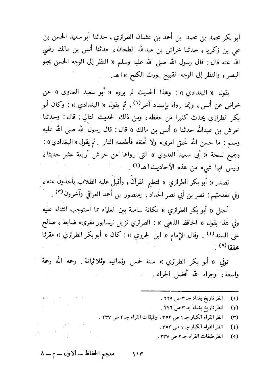 يقول «البغدادي»: وهذا الحديث لم يروه «أبو سعيد العدوي» عن خراش عن أنس، وإنما رواه بإسناد آخر (¬1)، ثم يقول «البغدادي»: وكان أبو بكر الطرازي يحدث كثيرا من حفظه، ومن ذلك الحديث التالي. قال: وحدثنا خراش بن عبد الله حدثنا «أنس بن مالك» قال: قال رسول الله صلى الله عليه وسلم: ما حسن الله خلق امرئ ولا خلقه فأطعمه النار. ثم يقول «البغدادي»:
