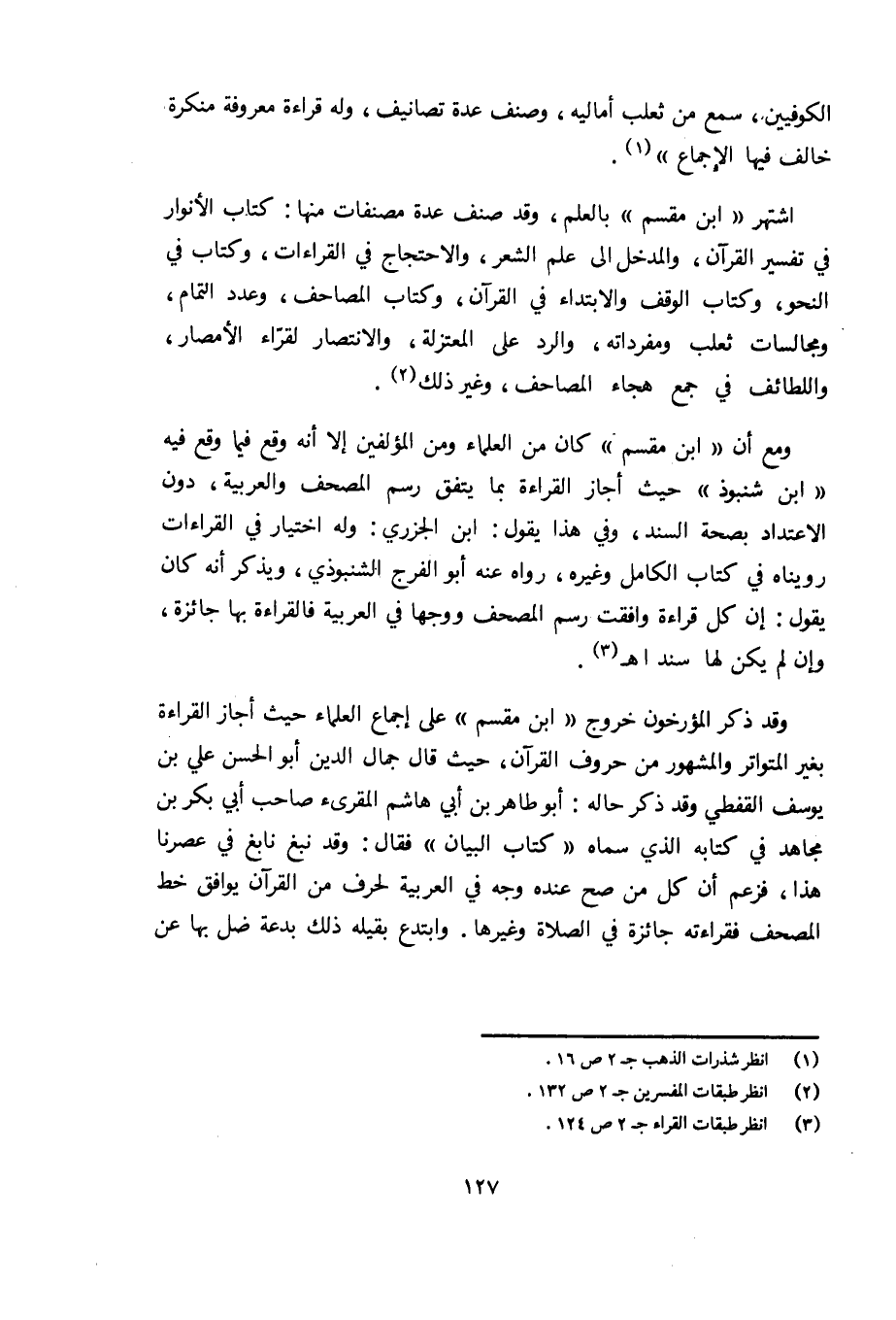ومع أن «ابن مقسم» كان من العلماء ومن المؤلفين إلا أنه وقع فيما وقع فيه «ابن شنبوذ» حيث أجاز القراءة بما يتفق رسم المصحف والعربية، دون الاعتداد بصحة السند، وفي هذا يقول: ابن الجزري: وله اختيار في القراءات رويناه في كتاب الكامل وغيره، رواه عنه أبو الفرج الشنبوذي، ويذكر أنه كان يقول: إن كل قراءة وافقت رسم المصحف ووجها في العربية فالقراءة بها جائزة، وإن لم يكن لها سند اهـ (¬3).