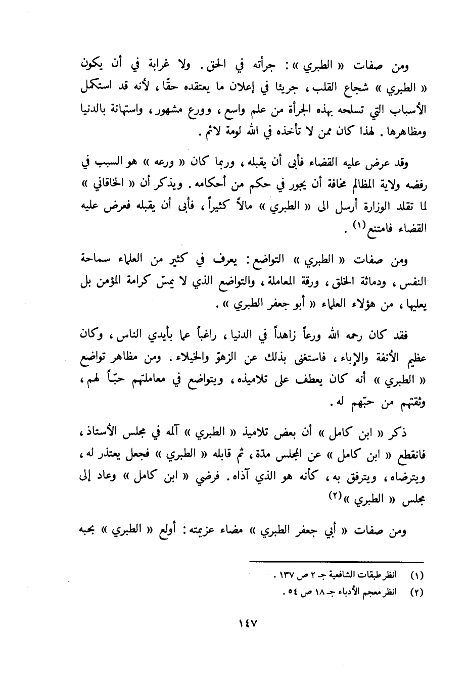 ذكر «ابن كامل» أن بعض تلاميذ «الطبري» آلمه في مجلس الأستاذ، فانقطع «ابن كامل» عن المجلس مدّة، ثم قابله «الطبري» فجعل يعتذر له، ويترضاه، ويترفق به، كأنه هو الذي آذاه. فرضي «ابن كامل» وعاد إلى مجلس «الطبري» (¬2) ومن صفات «أبي جعفر الطبري» مضاء عزيمته: أولع «الطبري» بحبه