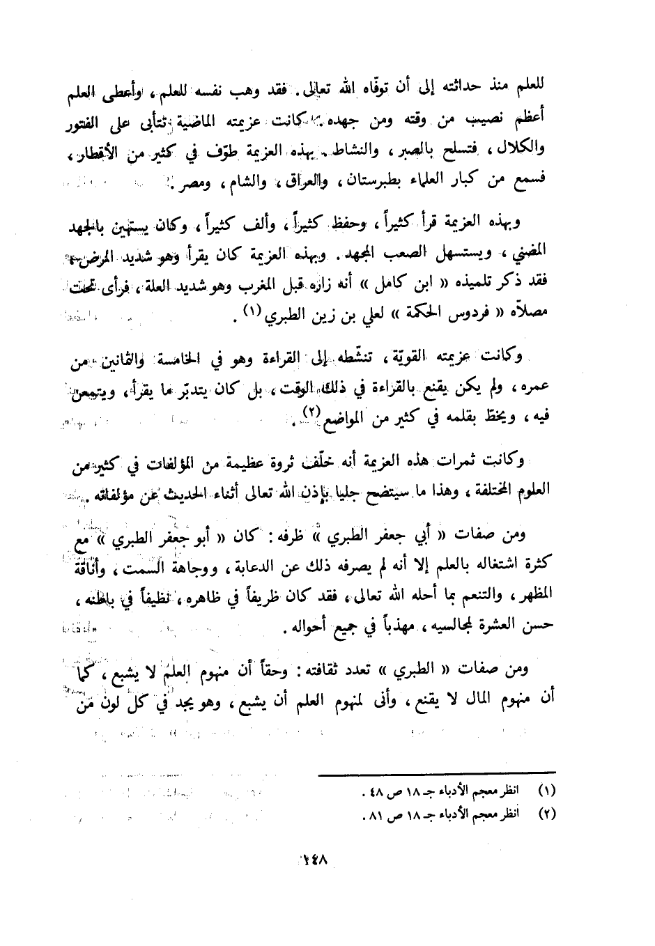 ومن صفات «الطبري» تعدد ثقافته: وحقا أن منهوم العلم لا يشبع، كما أن منهوم المال لا يقنع، وأنى لمنهوم العلم أن يشبع، وهو يجد في كل لون من