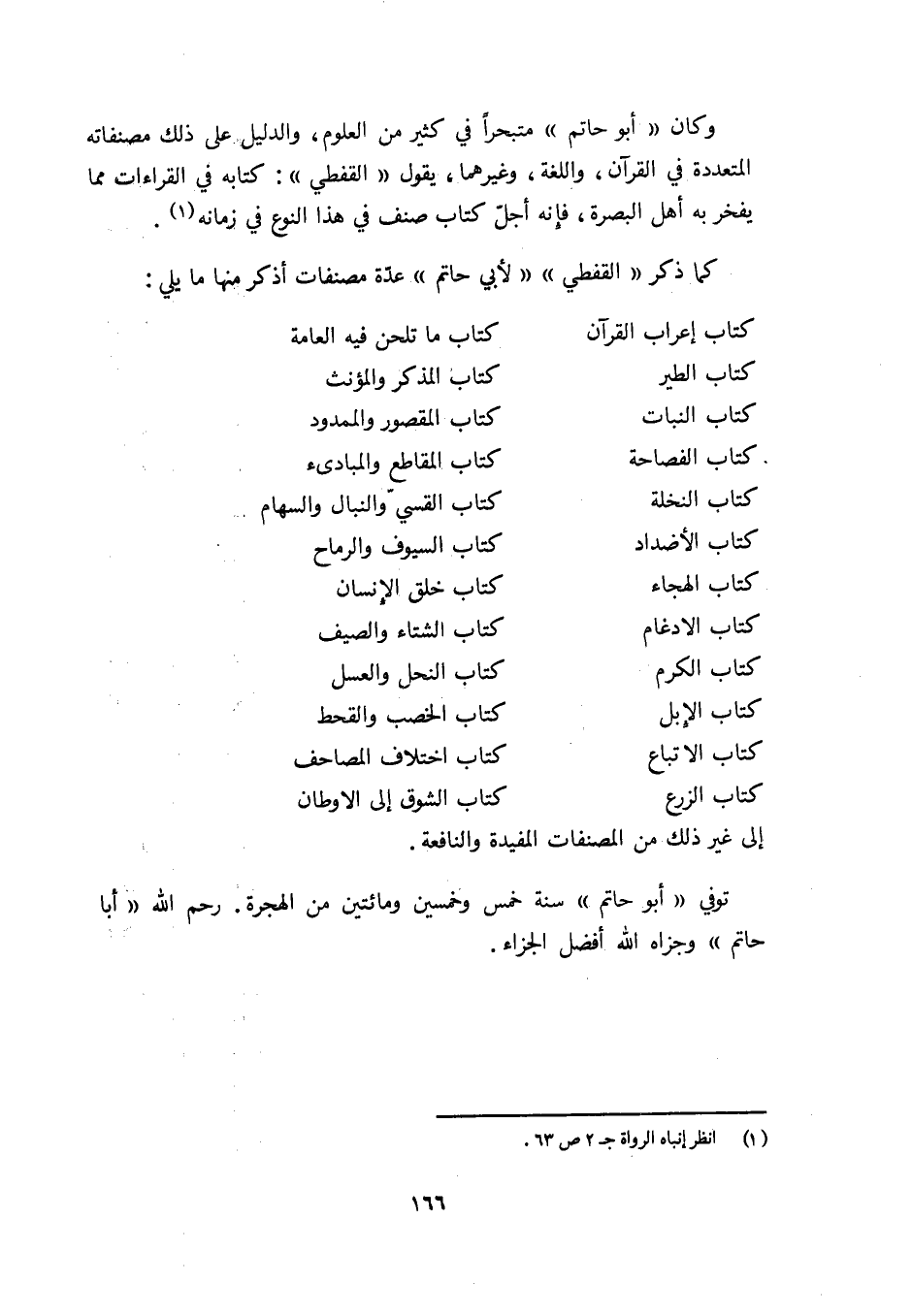 كما ذكر «القفطي» «لأبي حاتم» عدّة مصنفات أذكر منها ما يلي: