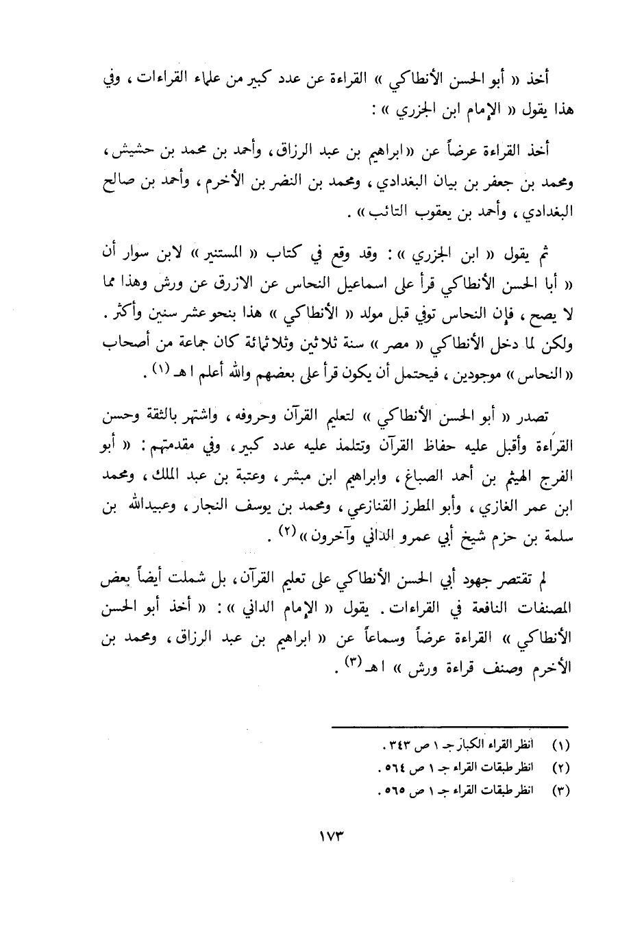 ثم يقول «ابن الجزري»: وقد وقع في كتاب «المستنير» لابن سوار أن «أبا الحسن الأنطاكي قرأ على اسماعيل النحاس عن الازرق عن ورش وهذا مما لا يصح، فإن النحاس توفي قبل مولد «الأنطاكي» هذا بنحو عشر سنين وأكثر.