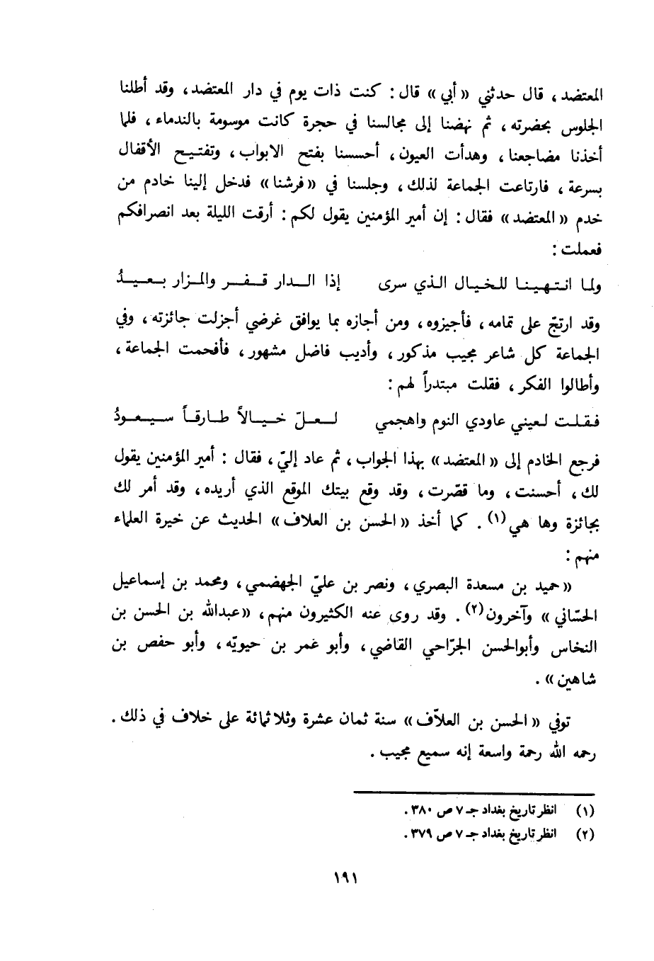فرجع الخادم إلى «المعتضد» بهذا الجواب، ثم عاد إليّ، فقال: أمير المؤمنين يقول لك، أحسنت، وما قصّرت، وقد وقع بيتك الموقع الذي أريده، وقد أمر لك بجائزة وها هي (¬1). كما أخذ «الحسن بن العلاف» الحديث عن خيرة العلماء منهم: