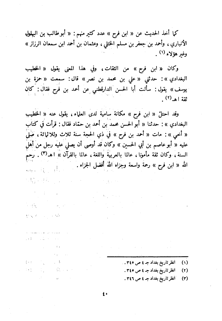 وكان «ابن فرح» من الثقات، وفي هذا المعنى يقول «الخطيب البغدادي»: حدثني «علي بن محمد بن نصر» قال: سمعت «حمزة بن يوسف» يقول: سألت أبا الحسن الدارقطني عن أحمد بن فرح فقال: كان ثقة اهـ (¬2).