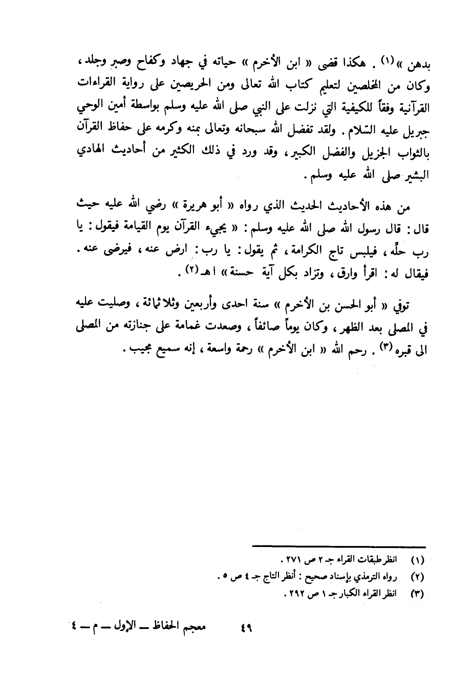 بدهن» (¬1). هكذا قضى «ابن الأخرم» حياته في جهاد وكفاح وصبر وجلد، وكان من المخلصين لتعليم كتاب الله تعالى ومن الحريصين على رواية القراءات القرآنية وفقا للكيفية التي نزلت على النبي صلى الله عليه وسلم بواسطة أمين الوحي جبريل عليه السّلام. ولقد تفضل الله سبحانه وتعالى بمنه وكرمه على حفاظ القرآن بالثواب الجزيل والفضل الكبير، وقد ورد في ذلك الكثير من أحاديث الهادي البشير صلى الله عليه وسلم.