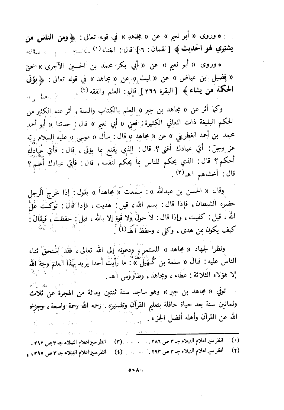 * وروى «أبو نعيم» عن «أبي بكر محمد بن الحسين الآجري» عن «فضيل بن عياض» عن «ليث» عن «مجاهد» في قوله تعالى: يُؤْتِي الْحِكْمَةَ مَنْ يَشاءُ [البقرة 269] قال: العلم والفقه (¬2).