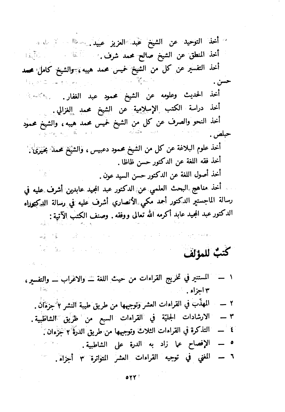 أخذ مناهج البحث العلمي عن الدكتور عبد المجيد عابدين أشرف عليه في رسالة الماجستير الدكتور أحمد مكي الأنصاري أشرف عليه في رسالة الدكتوراة الدكتور عبد المجيد عابد أكرمه الله تعالى ووفقه. وصنف الكتب الآتية: