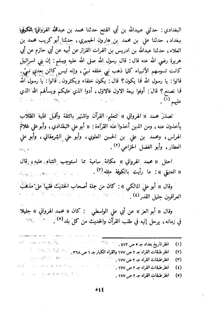 البغدادي: حدثني عبيد الله بن أبي الفتح حدثنا محمد بن عبد الله الهرواني الكوفي ببغداد، حدثنا علي بن محمد بن هارون الحميري، حدثنا أبو كريب محمد بن العلاء، حدثنا عبد الله بن ادريس بن الفرات القزاز عن أبيه عن أبي حازم عن أبي هريرة رضي الله عنه قال: قال رسول الله صلى الله عليه وسلم: إن بني إسرائيل كانت تسوسهم الأنبياء كلما ذهب نبي خلفه نبيّ، وإنه ليس كائن بعدي نبيّ.