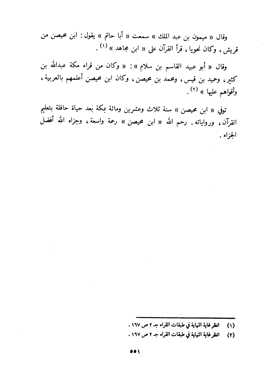 وقال «ميمون بن عبد الملك» سمعت «أبا حاتم» يقول: ابن محيصن من قريش، وكان نحويا، قرأ القرآن على «ابن مجاهد» (¬1).