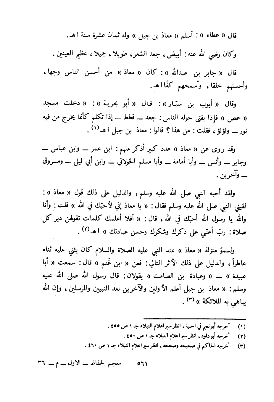 قال «جابر بن عبد الله»: كان «معاذ» من أحسن الناس وجها، وأحسنهم خلقا، وأسمحهم كفّا اهـ.