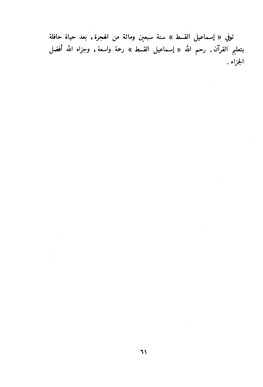 توفي «إسماعيل القسط» سنة سبعين ومائة من الهجرة، بعد حياة حافلة بتعليم القرآن. رحم الله «إسماعيل القسط» رحمة واسعة، وجزاه الله أفضل الجزاء.