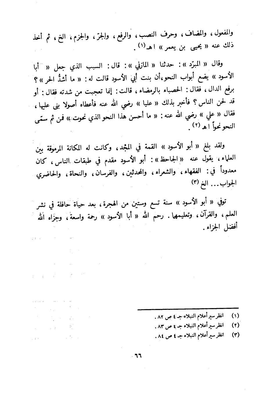 ولقد بلغ «أبو الأسود» القمة في المجد، وكانت له المكانة المرموقة بين العلماء، يقول عنه «الجاحظ»: أبو الأسود مقدم في طبقات الناس، كان معدودا في: الفقهاء، والشعراء، والمحدثين، والفرسان، والنحاة، والحاضري الجواب ... الخ (¬3) توفي «أبو الأسود» سنة تسع وستين من الهجرة، بعد حياة حافلة في نشر العلم، والقرآن، وتعليمهما. رحم الله «أبا الأسود» رحمة واسعة، وجزاه الله أفضل الجزاء.