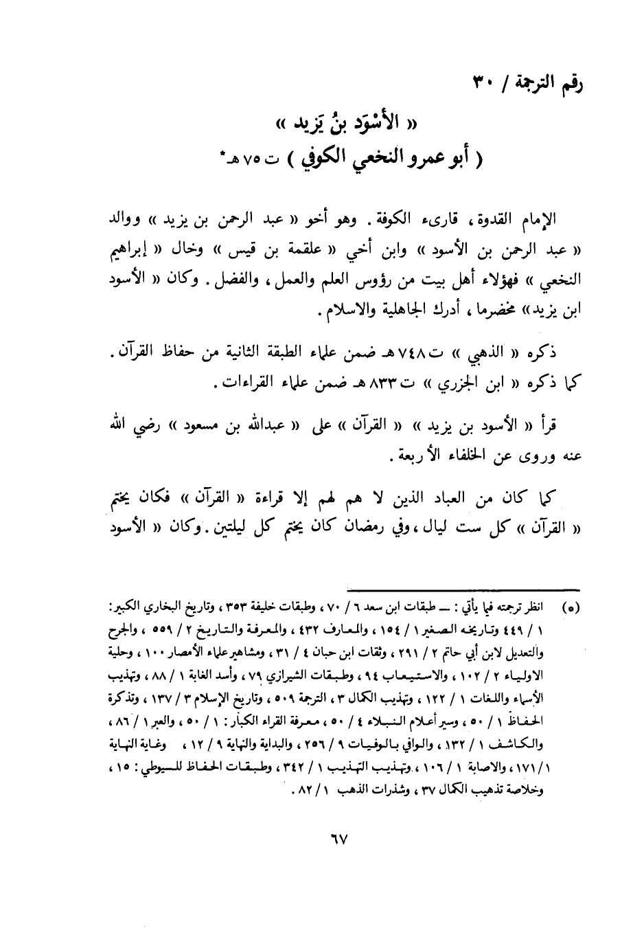 رقم الترجمة/ 30 «الأسود بن يزيد» (أبو عمرو النخعي الكوفي) ت 75 هـ (¬1)