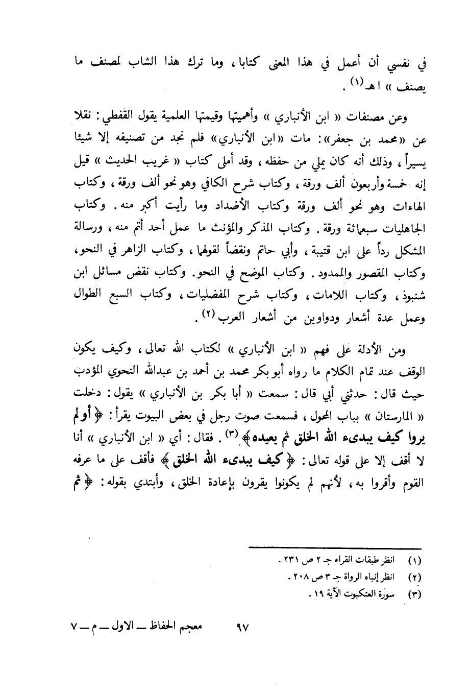 وعن مصنفات «ابن الأنباري» وأهميتها وقيمتها العلمية يقول القفطي: نقلا عن «محمد بن جعفر»: مات «ابن الأنباري» فلم نجد من تصنيفه إلا شيئا يسيرا، وذلك أنه كان يملي من حفظه، وقد أملى كتاب «غريب الحديث» قيل إنه خمسة وأربعون ألف ورقة، وكتاب شرح الكافي وهو نحو ألف ورقة، وكتاب الهاءات وهو نحو ألف ورقة وكتاب الأضداد وما رأيت أكبر منه. وكتاب الجاهليات سبعمائة ورقة. وكتاب المذكر والمؤنث ما عمل أحد أتم منه، ورسالة المشكل ردا على ابن قتيبة، وأبي حاتم ونقضا لقولهما، وكتاب الزاهر في النحو، وكتاب المقصور والممدود. وكتاب الموضح في النحو. وكتاب نقض مسائل ابن شنبوذ، وكتاب اللامات، وكتاب شرح المفضليات، وكتاب السبع الطوال وعمل عدة أشعار ودواوين من أشعار العرب (¬2).