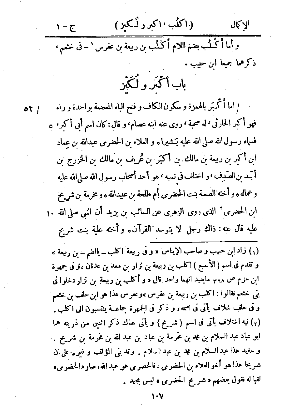 أما أكبر بالهمزة وسكون الكاف وفتح الباء المعجمة بواحدة وراء فهو أكبر الحارثي، له صحبة، روى عنه ابنه عصام، وقال: كان اسم أبي أكبر، فسماه رسول الله صلى الله عليه بشيرًا والعلاء بن الحضرمي عبد الله بن عماد بن أكبر بن ربيعة بن مالك بن أكبر بن عريف بن مالك بن الخزرج بن أبد بن الصدف، واختلف في نسبه، هو أحد أصحاب رسول الله صلى الله عليه وعماله وأخته الصعبة بنت الحضرمي أم طلحة بن عبيد الله ومخرمة بن شريح بن الحضرمي1 الذي روى الزهري عن السائب بن يزيد أن النبي صلى الله عليه قال عنه: ذاك رجل لا يتوسد القرآن وأخته علية بنت شريح