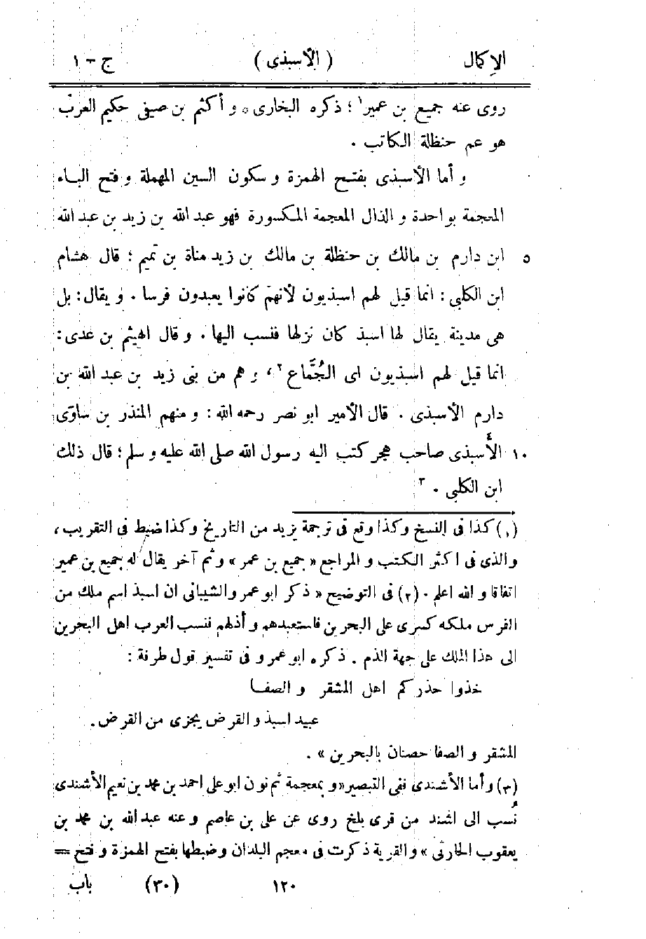 وأما الأسبذي بفتح الهمزة وسكون السين المهملة وفتح الباء المعجمة بواحدة والذال المعجمة المكسورة فهو عبد الله بن زيد بن عبد الله بن دارم بن مالك بن حنظلة بن مالك بن زيد مناة بن تميم؛ قال هشام بن الكلبي: إنما قيل لهم أسبذيون لأنهم كانوا يعبدون فرسًا. ويقال: بل هي مدينة يقال لها أسبذ كان نزلها فنسب إليها. وقال الهيثم بن عدي: إنما قيل لهم أسبذيون أي الجُمَّاع2، وهم من بني زيد بن عبد الله بن دارم الأسبذي. قال الأمير أبو نصر رحمة الله: ومنهم المنذر بن ساوَى الأسبذي صاحب هجر كتب إليه رسول الله صلى الله عليه وسلم؛ قال ذلك ابن الكلبي3.