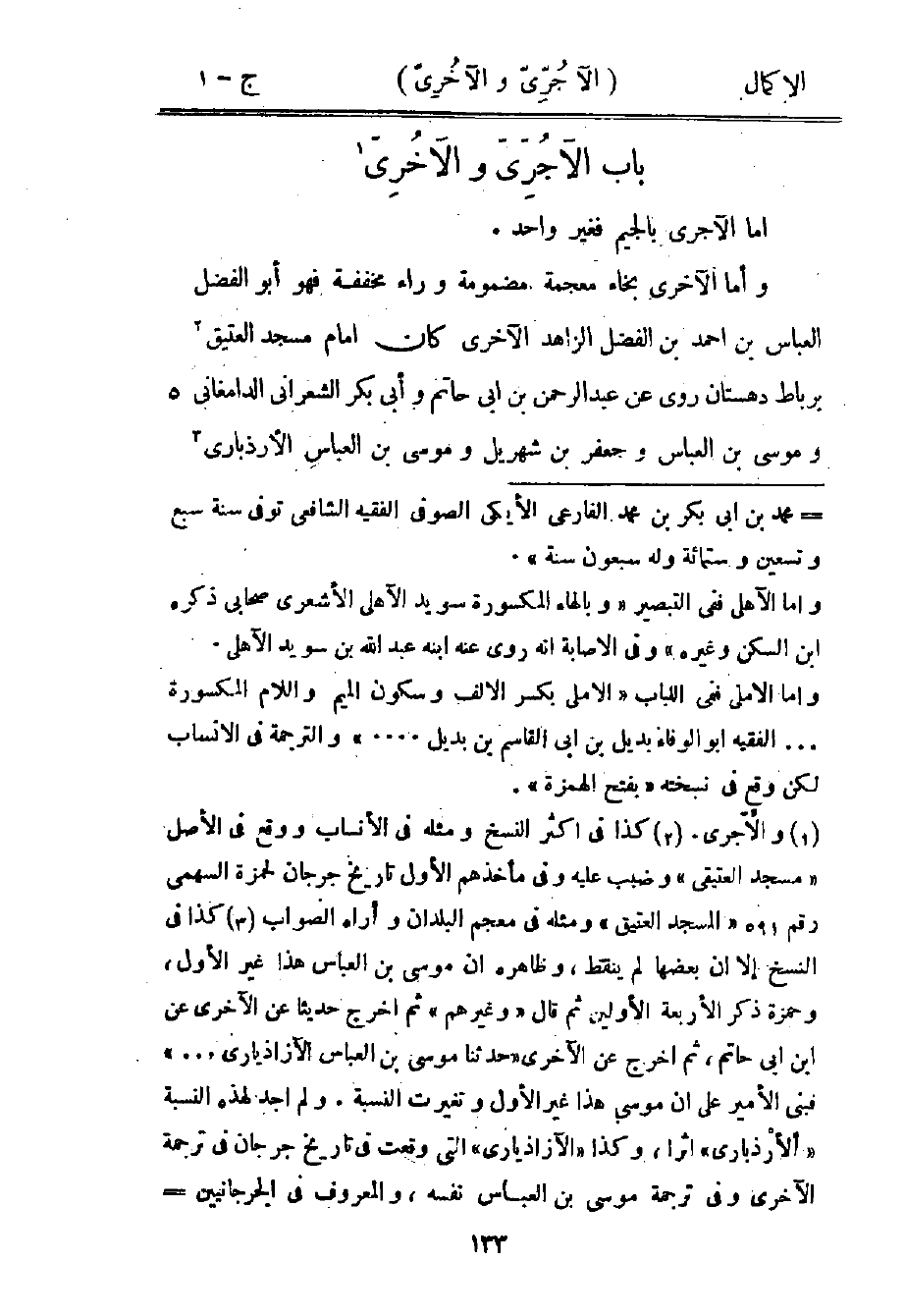3 كذا في النسخ إلا أن بعضها لم ينقط، وظاهره أن موسى بن العباسي هذا غير الأول، وحمزة ذكر الأربعة الأولين ثم قال: "وغيرهم" ثم أخرج حديثا عن الآخرى عن ابن أبي حاتم، ثم أخرج عن الآخرى "حدثنا موسى بن العباس الآزاذياري ... " فبنى الأمير على أن موسى هذا غير الأول وتغيرت النسبة. ولم أجد لهذه النسبة "الأرذبارى" أثرا، وكذا "الآزاذياري" التي وقعت في تاريخ جرجان في ترجمة الآخرى، وفي ترجمة موسى بن العباس نفسه، والمعروف في الجرجانيين "الآزاذوارى" نسبة إلى ازاذوار، ولا يبعد عن أن تكون فيها قرية أخرى يقال لها "ازاذيار" والله أعلم.