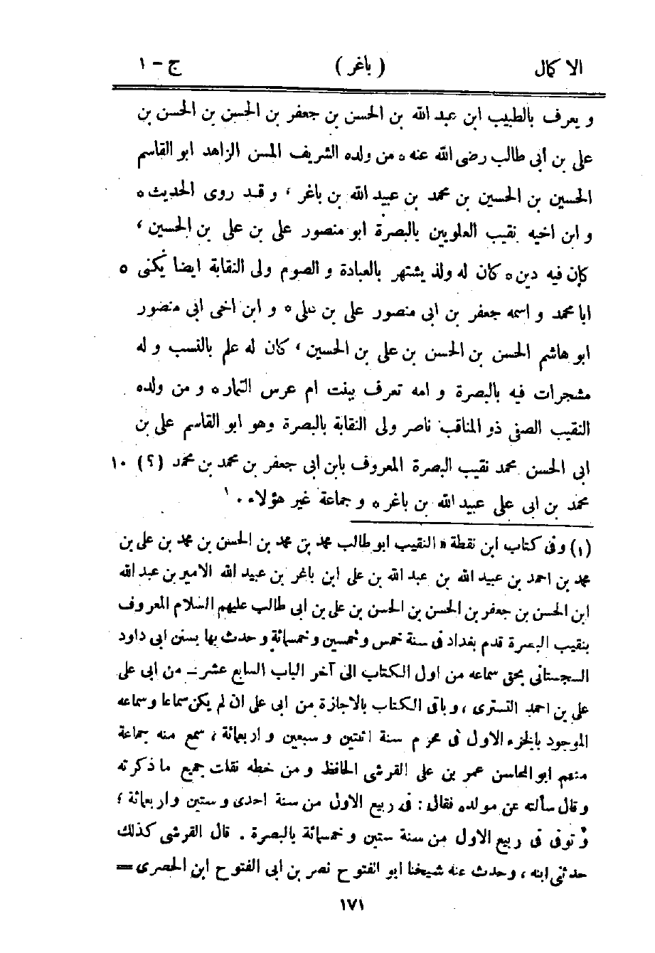1 وفي كتاب ابن نقطة "النقيب أبو طالب محمد بن محمد بن الحسن بن محمد بن علي بن محمد بن أحمد بن عبيد الله بن عبد الله بن علي بن باغر بن عبيد الله الأمير بن عبد الله بن الحسن بن جعفر بن الحسن بن الحسن بن علي بن أبي طالب عليهم السلام المعروف بنقيب البصرة قدم بغداد في سنة خمسة وخمسين وخمسمائة وحدث بها بسنن أبي داود السجستاني بحق سماعه من أول الكتاب إلى آخر الباب السابع عشر، من أبي علي علي بن أحمد التستري، وباقي الكتاب بالإجازة من أبي علي إن لم يكن سماعا وسماعه الموجود بالجزء الأول في محرم سنة اثنتين وسبعين وأربعمائة، سمع منه جماعة منهم أبو المحاسن عمر بن علي القرشي الحافظ، ومن خطه نقلت جميع ما ذكرته، وقال: سألته عن مولده، فقال: في ربيع الأول من سنة إحدى وستين وأربعمائة، وتوفي في ربيع الأول من سنة ستين وخمسمائة بالبصرة. قال القرشي: كذلك حدثني ابنه، وحدث عنه شيخنا أبو الفتوح نصر بن أبي الفتوح ابن الحصري =