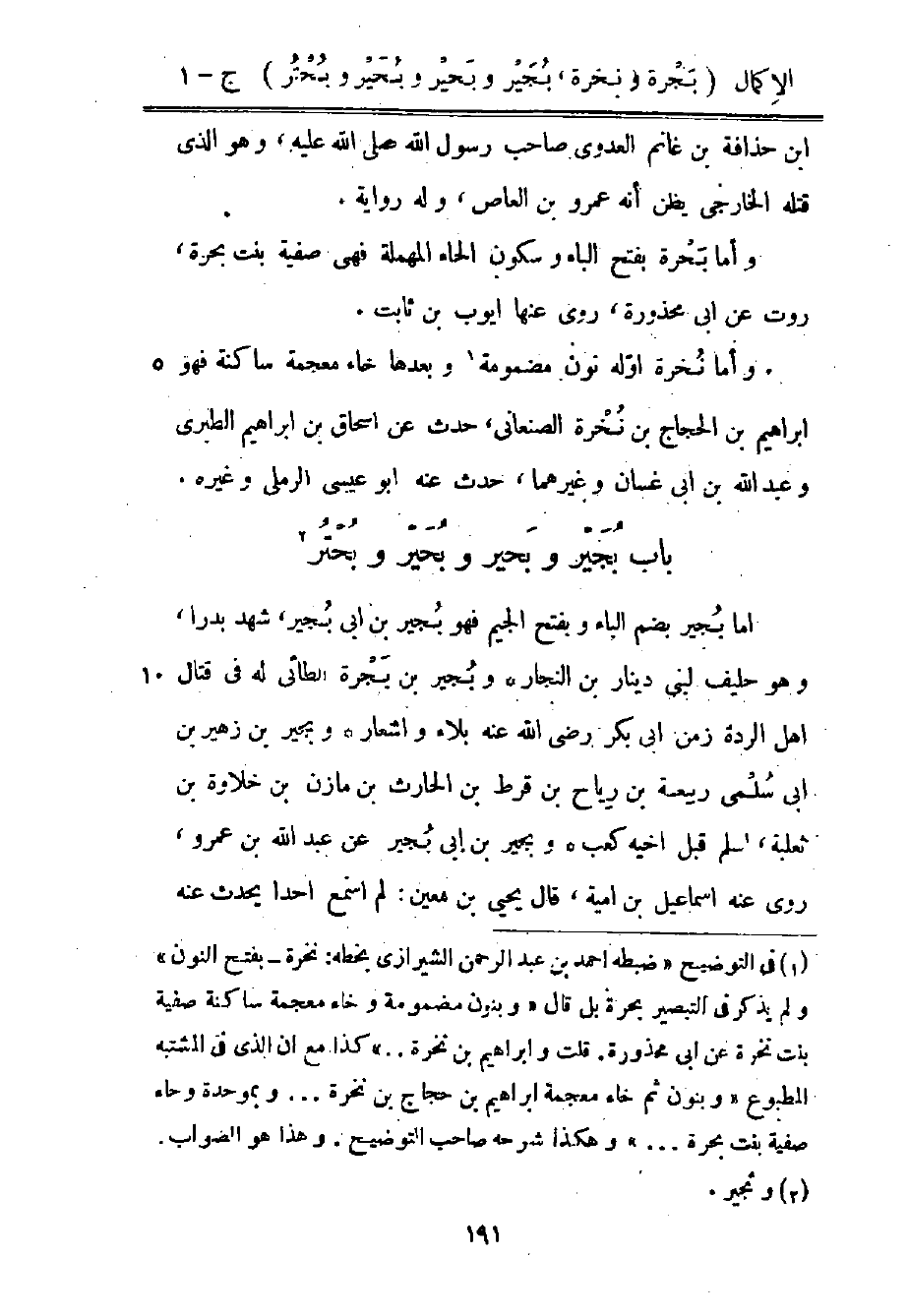 1 في التوضيح "ضبطه أحمد بن عبد الرحمن الشيرازي بخطه: نخرة، بفتح النون" ولم يذكر في التبصير بحرة بل قال: "وبنون مضمومة وخاء معجمة ساكنة صفية بنت نخرة عن أبي محذورة. قلت: وإبراهيم بن نخرة ... " كذا مع أن الذي في المشتبه المطبوع "وبنون ثم خاء معجمة إبراهيم بن حجاج بن نخرة ... وبموحدة وحاء صفية بنت بحرة ... " وهكذا شرحه صاحب التوضيح. وهذا هو الصواب