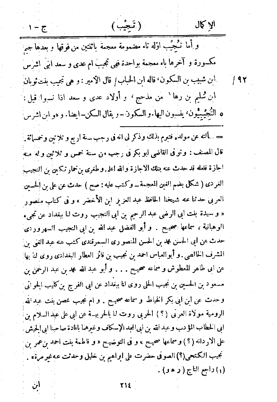 = سألته عن مولده فتبرم بذلك وذكر لي أنه في رجب سنة أربع وثلاثين وخمسمائة قال المصنف: وتوفي القاضي أبو بكر في رجب خمس وثلاثين وله منه إجازة فلعله قد حدث عنه بتلك الإجازة والله أعلم، وطغرى بن خمار تكين بن النجيب الغردي "شكل بضم الغين المعجمة، وكتب عليه: صح" حدث عن بن الحسين العربي حدثنا عن شيخنا الحافظ عبد العزيز ابن الأخضر" وفي كتاب منصور "وسيدة بنت أبي الرضى عبد الرحيم بن أبي النجيب روت لنا ببغداد عن تجني الوهبانية، سماعها صحيح. وأبو الفضل عبد الله بن أبي النجيب السهروردي حدث عن أبي الحسن محمد بن الحسن المنصوري السمرقندي كتب عنه عبد الغني بن المشرف الخالصي. وأبو العباس أحمد بن نجيب بن فائز العطار البغدادي روى لنا بها عن أبي طاهر المعطوش وسماعه صحيح ... وأبو عبد الله محمد بن عبد الرحمن بن مسعود بن الحسين بن نجيب الحلي روى لنا ببغداد عن أبي الفرج بن كليب الجواني، وحدث عن ابن أبي بكر الخياط وسماعه صحيح. وأم نجيب غصن بنت عبد الله الرومية مولاة العرني "؟ " الحربي روت لنا بالحربية عن أبي علي عبد السلام بن أبي الخطاب المؤدب وعبد الله بن أبي المجد الإسكاف وغيرهما بإفادة صاحبنا أبي الجيش على الأردانة "؟ " وسماعها صحيح "وفي التوضيح "وفاطمة بنت أحمد بن عمر بن نجيب الكتحي "؟ " الصوفي حضرت على إبراهيم بن خليل وحدثت عنه غير مرة".