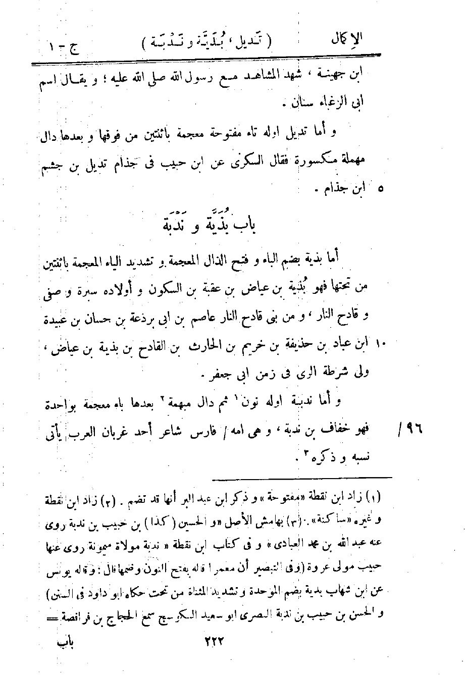 3 بهامش الأصل "والحسين "كذا" بن حبيب بن ندبة روى عنه عبد الله بن محمد العبادي" وفي كتاب ابن نقطة "ندبة مولاة ميمونة روى عنها حبيب مولى عروة "وفي التبصير أن معمرا قاله بفتح النون وضمها قال: وقاله يونس عن ابن شهاب بدية بضم الموحدة وتشديد المثناة من تحت حكاه أبو داود في السنن" والحسن بن حبيب بن ندبة البصري أبو سعيد الكوسج سمع الحجاج بن فرافصة قاله البخاري، وقال محمد بن عبد الله الحضرمي مات سنة سبع وتسعين ومائة. وإبراهيم بن خالد بن عبيد القرشي الصنعاني المؤذن روى عن رباح بن زيد الصنعاني وغيره، روى عنه أحمد بن حنبل فقال: حدثنا إبراهيم بن ندبة حدثنا رباح بن زيد".