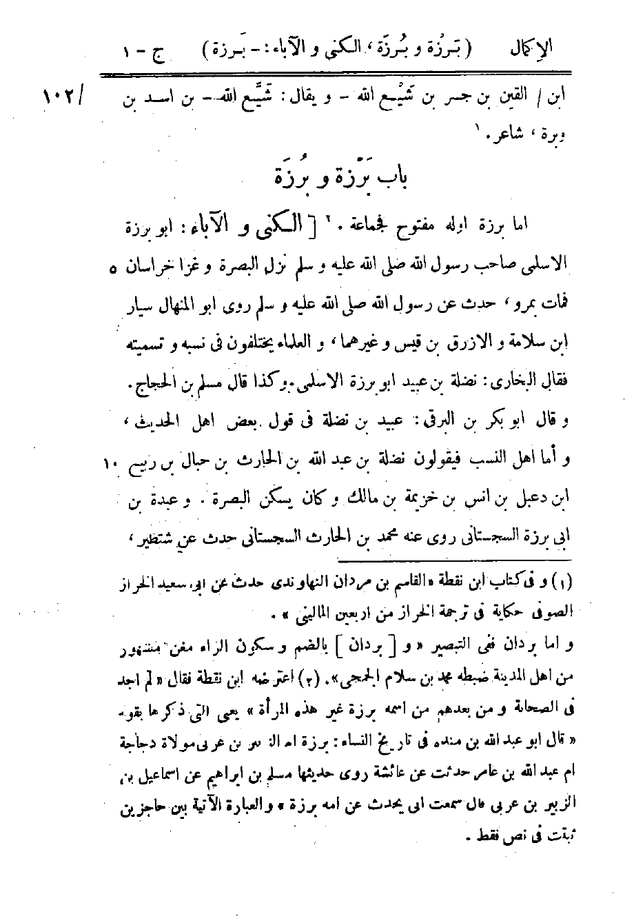 1 اعترضه ابن نقطة فقال: "لم أجد في الصحابة ومن بعدهم من اسمه برزة غير هذه المرأة" يعني التي ذكرها بقوله: "قال أبو عبد الله بن منده في تاريخ النساء: برزة أم الزبير بن عربي مولاة دجاجة أم عبد الله بن عامر حدثت عن عائشة روى حديثها مسلم بن إبراهيم عن إسماعيل بن الزبير بن عربي قال: سمعت أبي يحدث عن أمه برزة "والعبارة الآتية بين حاجزين ثبتت في نص فقط.