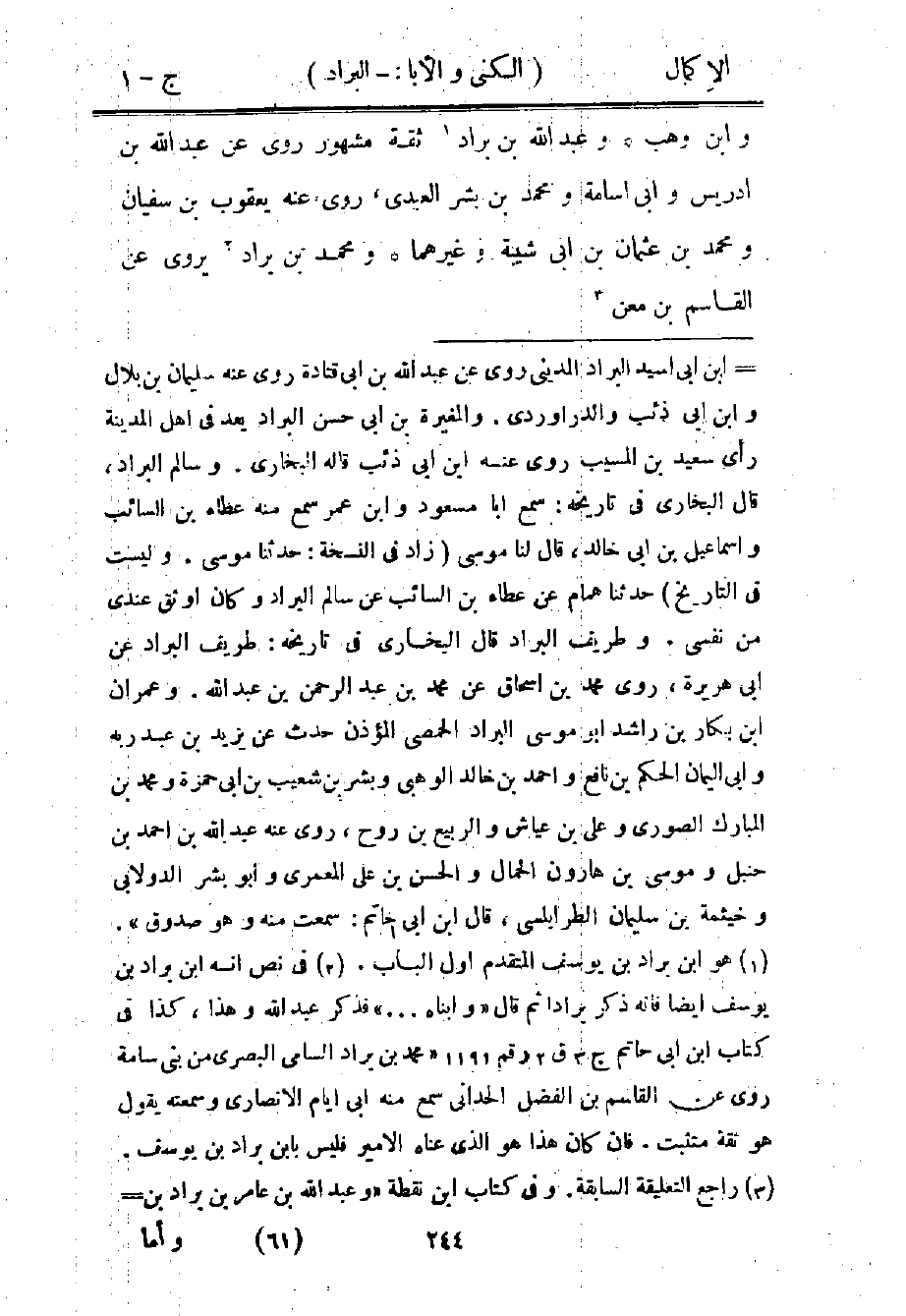 2 في نص أنه ابن براد بن يوسف أيضا فإنه ذكر برادا ثم قال: "وابناه ... " فذكر عبد الله وهذا، كذا وفي كتاب ابن أبي حاتم ج3 ق2 رقم 1191 "محمد بن براد السامي البصري من بني سامة روى عن القاسم بن الفضل الحداني سمع منه أبي أيام الأنصاري وسمعته يقول: هو ثقة متثبت. فإن كان هذا هو الذي عناه الأمير فليس بابن براد بن يوسف.
