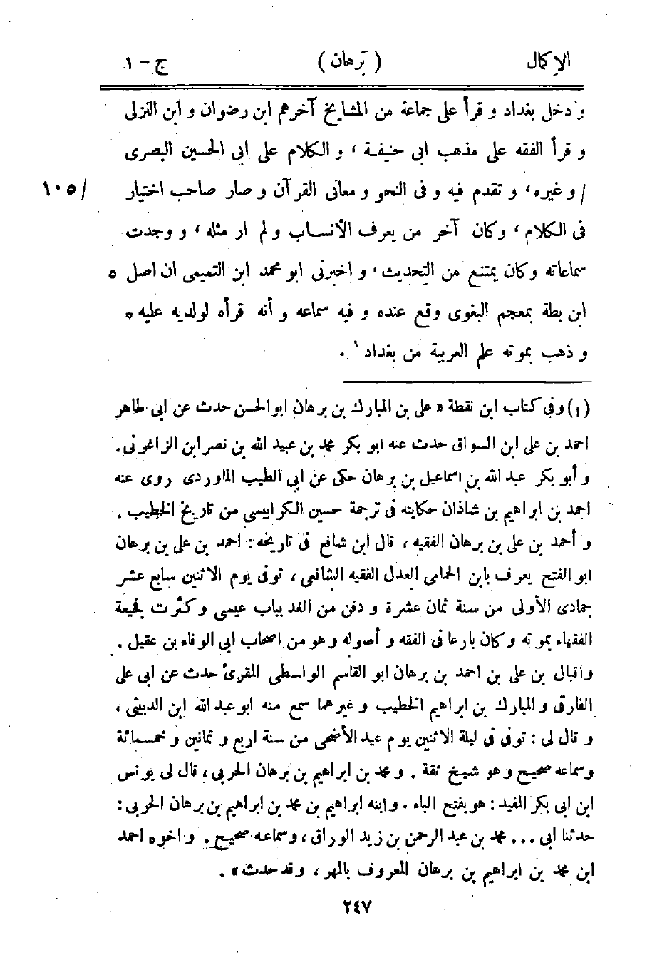 1 وفي كتاب ابن نقطة "علي بن المبارك بن برهان أبو الحسن حدث عن أبي طاهر أحمد بن علي بن السواق حدث عنه أبو بكر محمد بن عبيد الله بن نصر ابن الزاغوني. وأبو بكر عبد الله بن إسماعيل بن برهان حكى عن أبي الطيب الماوردي روى عنه أحمد بن إبراهيم بن شاذان حكايته في ترجمة حسين الكرابيسي من تاريخ الخطيب. وأحمد بن إبراهيم بن علي برهان الفقيه، قال ابن شافع في تاريخه: أحمد بن علي بن برهان أبو الفتح يعرف بابن الحمامي العدل الفقيه الشافعي، توفي يوم الاثنين سابع عشر جمادى الأولى من سنة ثمان عشرة ودفن من الغد بباب عيسى وكثرت فجيعة الفقهاء بموته، وكان بارعا في الفقه وأصوله وهو من أصحاب أبي الوفاء بن عقيل. وإقبال بن علي بن أحمد بن برهان أبو القاسم الواسطي المقرئ حدث عن أبي علي الفارقي والمبارك بن إبراهيم الخطيب وغيرهما سمع منه أبو عبد الله ابن الدبيثي، وقال لي: توفي في ليلة الاثنين يوم عيد الأضحى من سنة أربع وثمانين وخمسمائة وسماعه صحيح وهو شيخ ثقة. ومحمد بن إبراهيم بن برهان الحربي، قال لي يونس بن أبي بكر المفيد: هو بفتح الباء. وابنه إبراهيم بن محمد بن إبراهيم بن برهان الحربي: حدثنا أبي ... محمد بن عبد الرحمن بن زيد الوراق، وسماعه صحيح. وأخوه أحمد بن محمد بن إبراهيم بن برهان المعروف بالمهر، وقد حدث".
