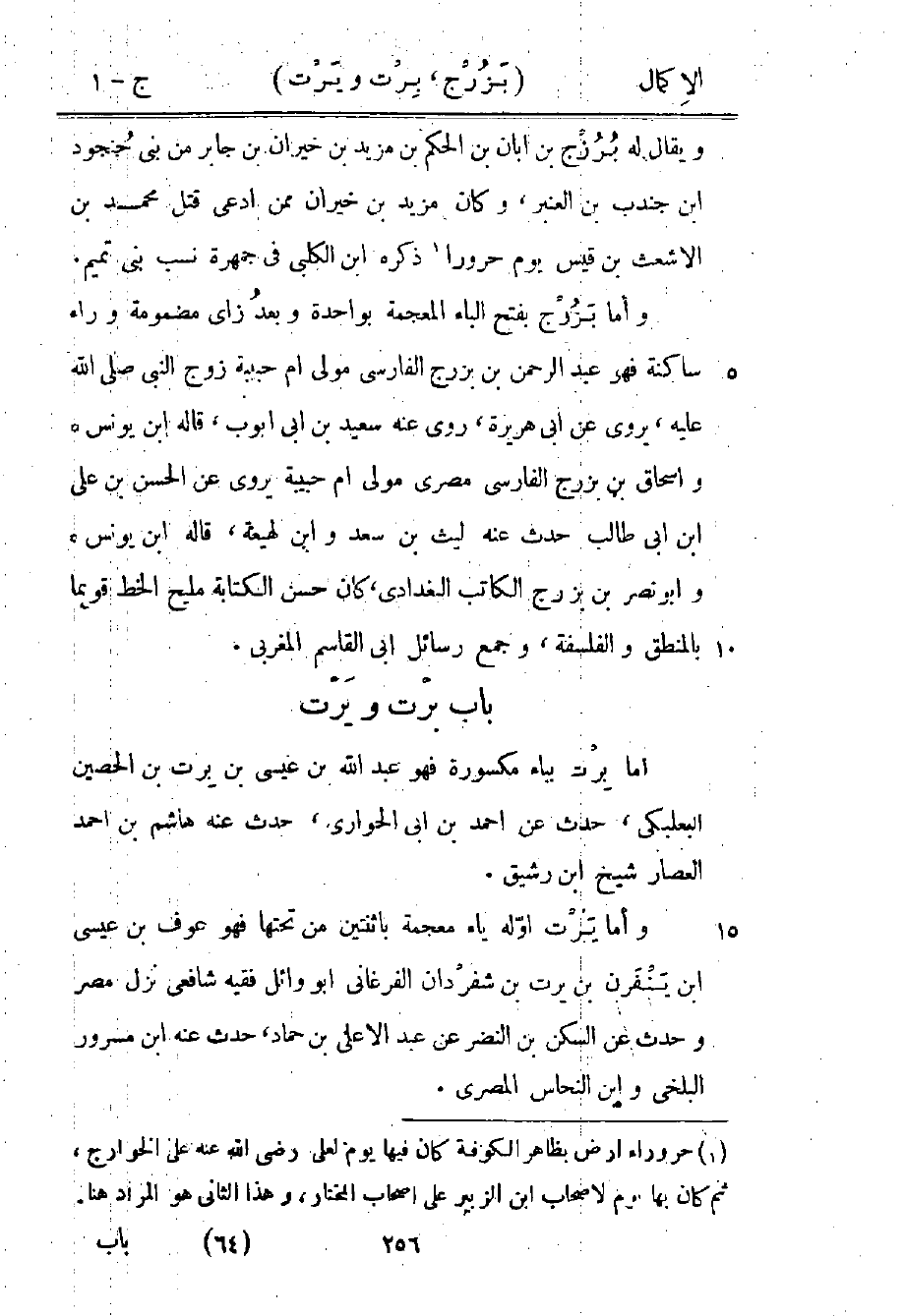 وأما بزرج بفتح الباء المعجمة بواحدة وبعد زاي مضمومة وراء ساكنة، فهو عبد الرحمن بن بزرج الفارسي مولى أم حبيبة زوج النبي صلى الله عليه وسلم، يروي عن أبي هريرة، روى عنه سعيد بن أبي أيوب، قاله ابن يونس وإسحاق بن بزرج الفارسي مصري مولى أم حبيبة يروي عن الحسن بن علي بن أبي طالب حدث عنه ليث بن سعد وابن لهيعة، قاله ابن يونس وأبو نصر بن بزرج الكاتب البغدادي، كان حسن الكتابة مليح الخط قويمًا بالمنطق والفلسفة، وجمع رسائل أبي القاسم المغربي.